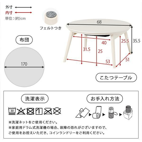 まるくてかわいいフォルムが特徴の丸型こたつで、ふんわりとした柔らかい印象のお部屋に。ワンルームにも置きやすい直径68cmはコンパクトながら、作業にも適した程よい天板サイズ。温まりながら、デスクワークや読書ができます。