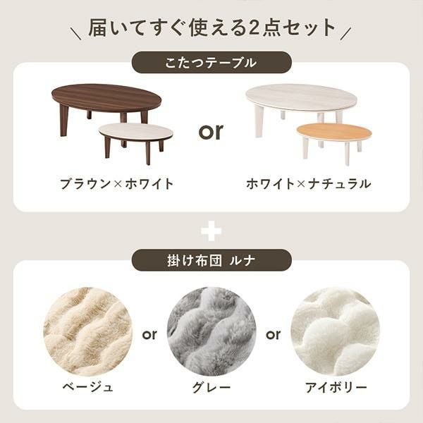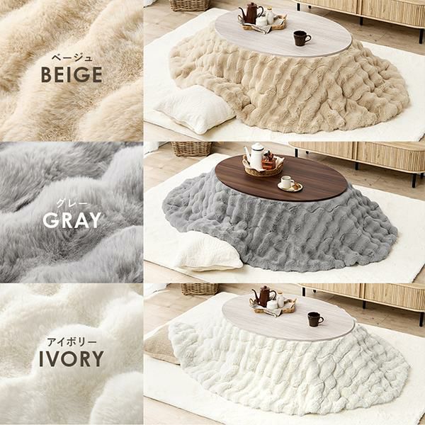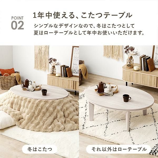 天板がリバーシブルでオールシーズン活躍するカジュアルコタツとふわふわでなめらかな触り心地が特徴の布団をコーディネート。角がない楕円形テーブルにふわふわのコタツ布団をあわせることでお部屋がやわらかい雰囲気に。こたつ布団はふわふわのラビットファーのような長い毛足。ずっと撫でていたくなるような触り心地です。布団は洗濯機で丸洗いできるので、かわいいだけでなく日々のお手入れも簡単。もちろんテーブのみでオールシーズン使用可能です♪