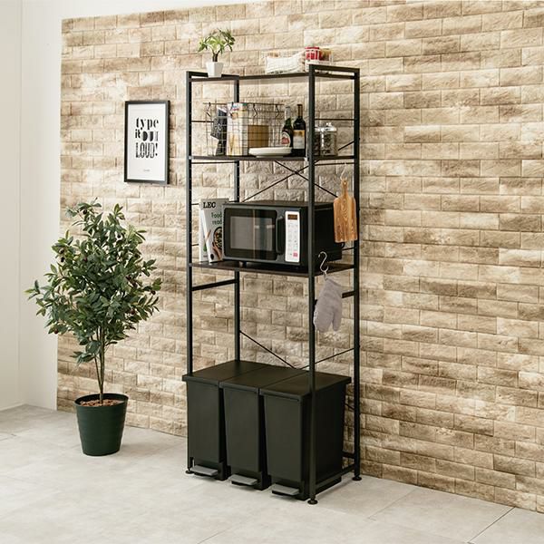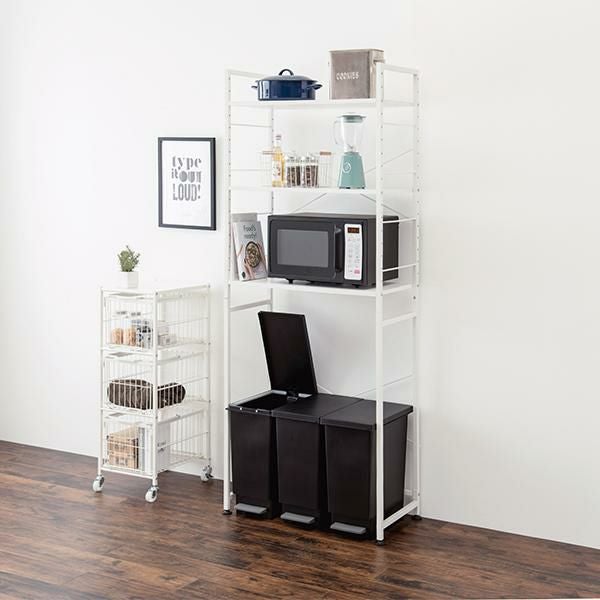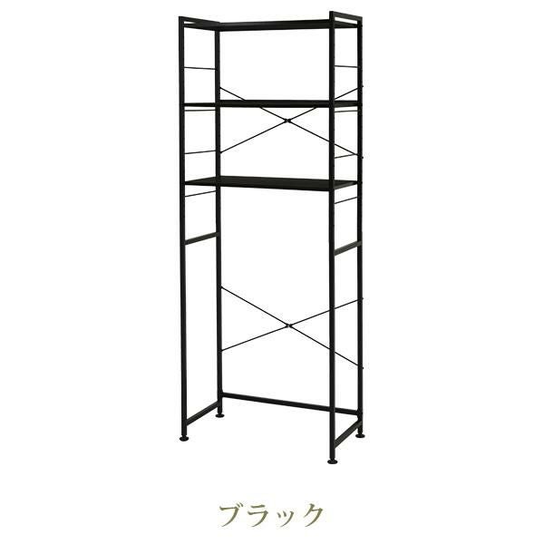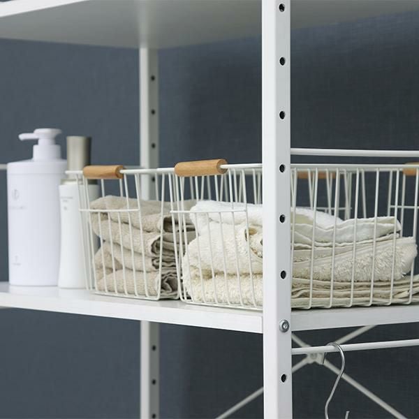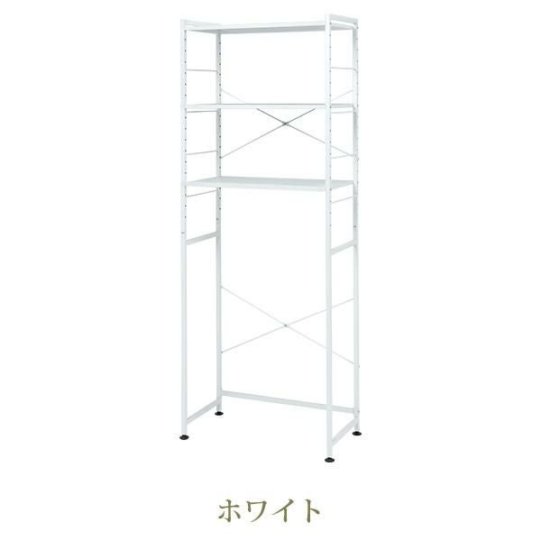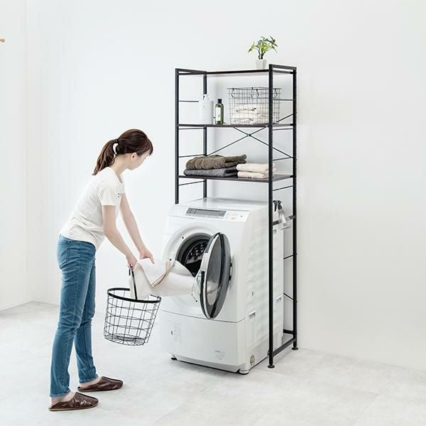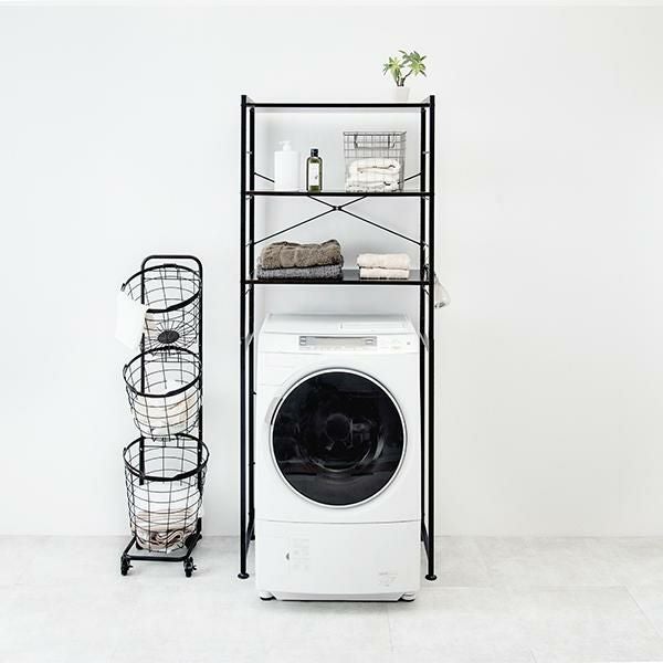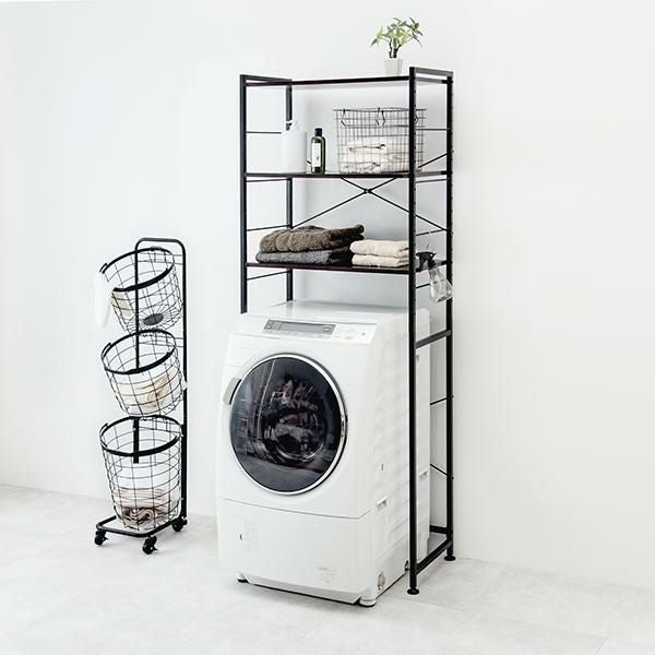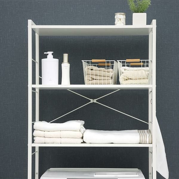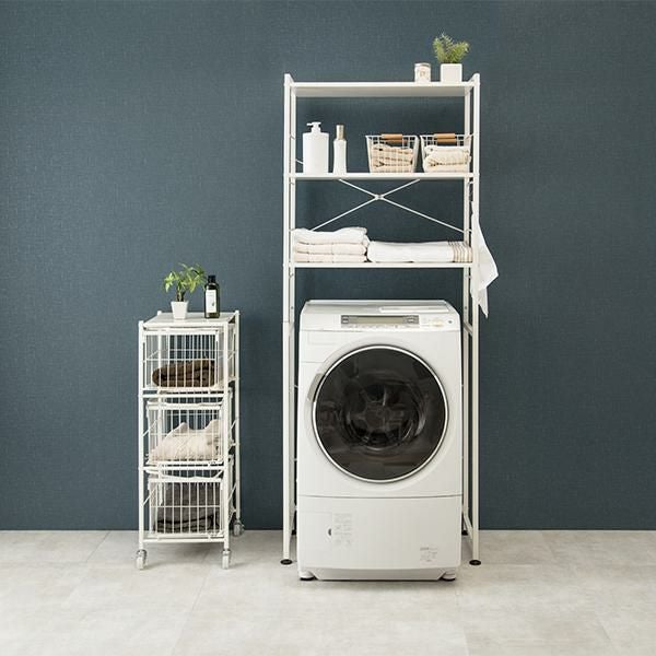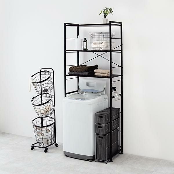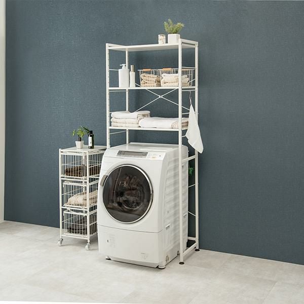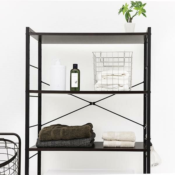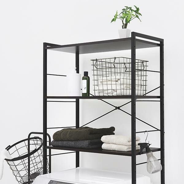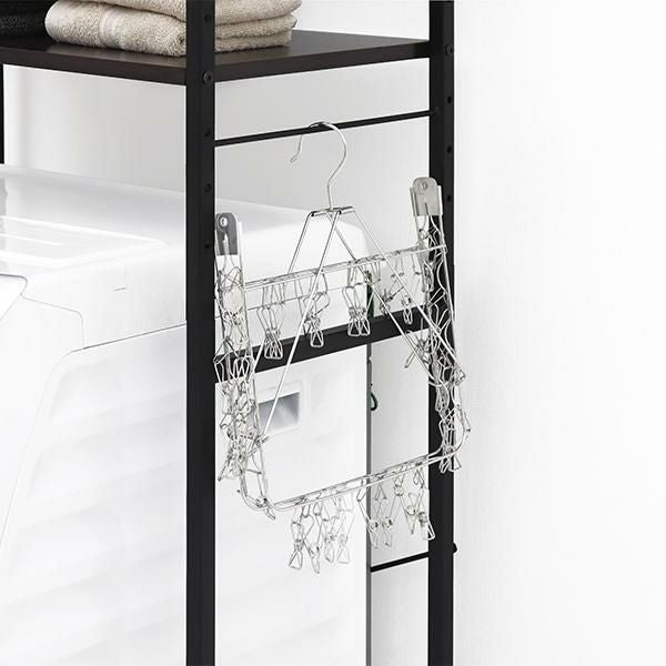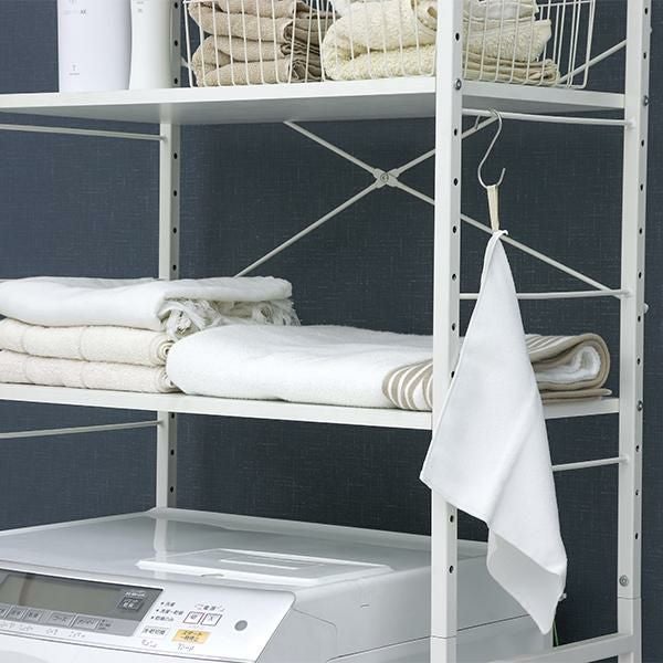 3枚の可動棚は収納したいものに合わせて、5cm間隔で調整できます。サイドフレームには、S字フックなどを使うことで、ランドリー用品を引っかけて収納することも可能。タオルなどは、直接かけてお使いいただけます。