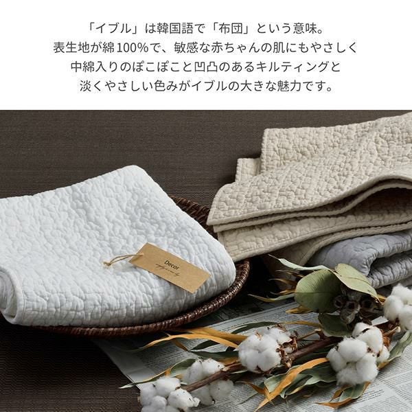 綿100%の表生地はサラッとした手触りで肌にやさしく、中綿入りのポコポコとした凹凸のあるキルティングと淡く優しい色みが魅力♪