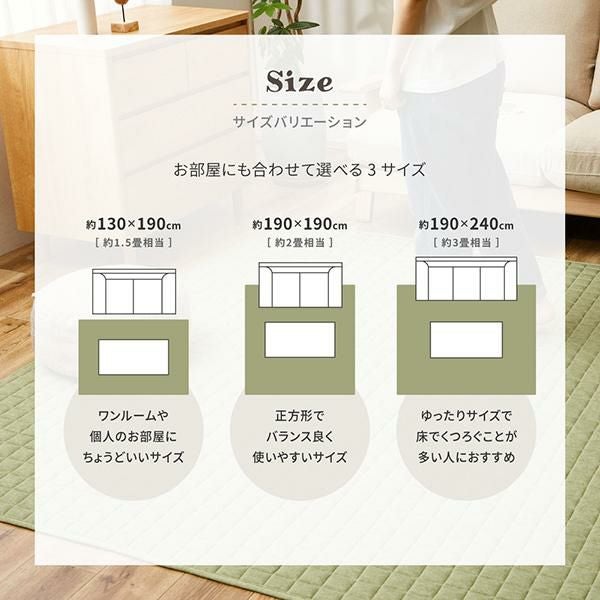 オールシーズン対応で、すべり止め付き。ホットカーペット・床暖房対応可能で機能面もバッチリ。
