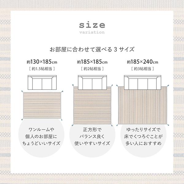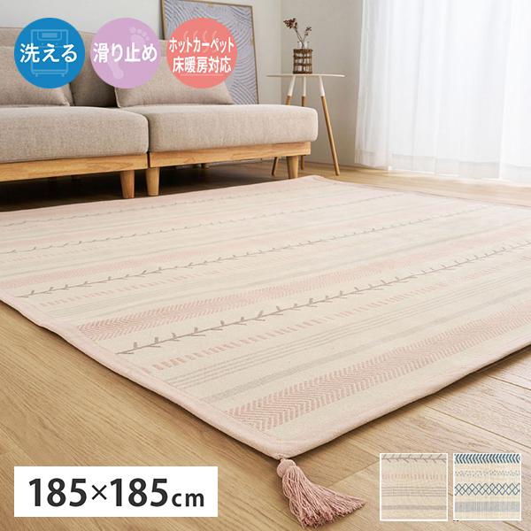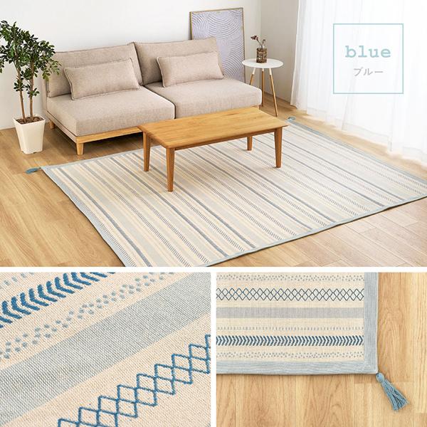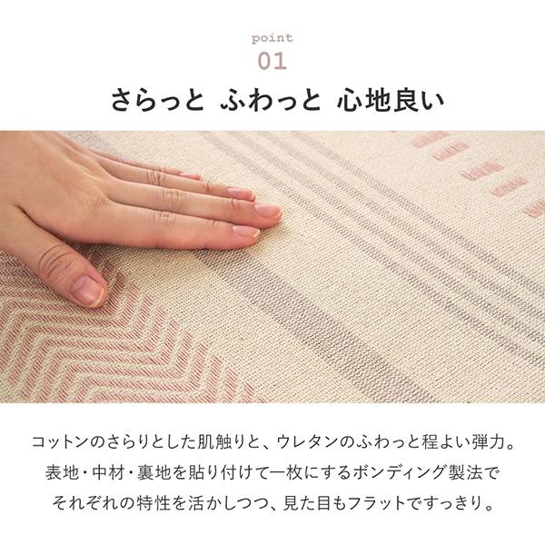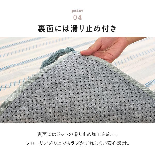 ざっくりとした織りとやわらかな風合いが特長のインド綿ラグ。さらっとした肌ざわりと高い吸湿性で蒸し暑い季節も快適に使えます。ウレタン入りのボンディング製法により、ふんわりと程よい弾力をプラス。洗濯機で洗えるため、小さなお子さまやペットのいるご家庭でも清潔を保てます。滑り止め付きでフローリングでも使いやすく、ホットカーペット・床暖房にも対応。オールシーズン活躍する使いやすいラグです。