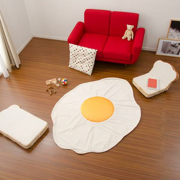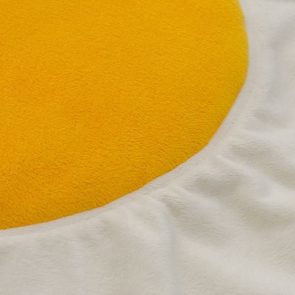 リラックスタイムに大活躍な、目玉焼きのブランケット。Lサイズは丸まって寝るのにちょうど良いサイズ感。