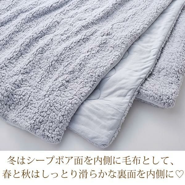 吸湿発熱するので、冬はシープボア面を内側に毛布として、春と秋はしっとり滑らかな裏面を内側にすれば1枚で3シーズン使用可能。
