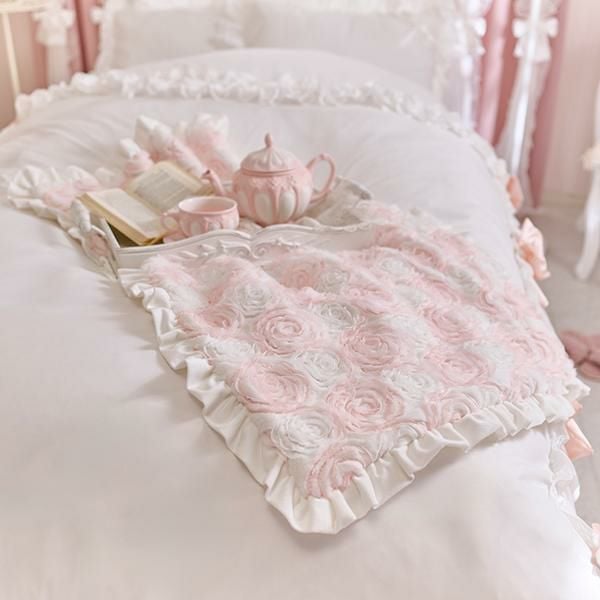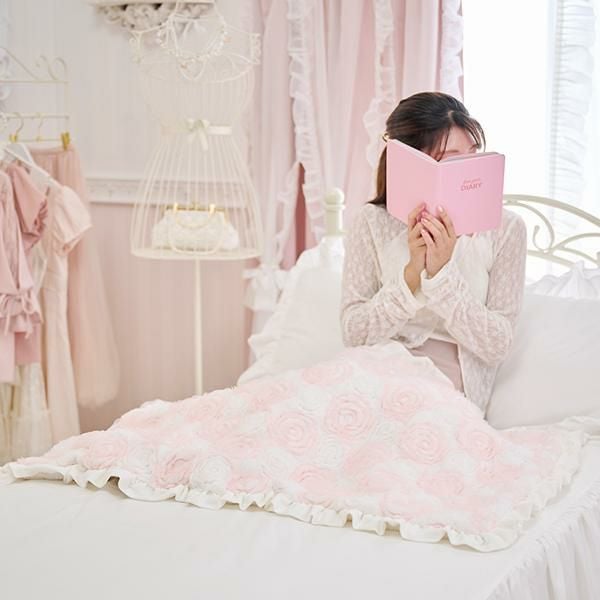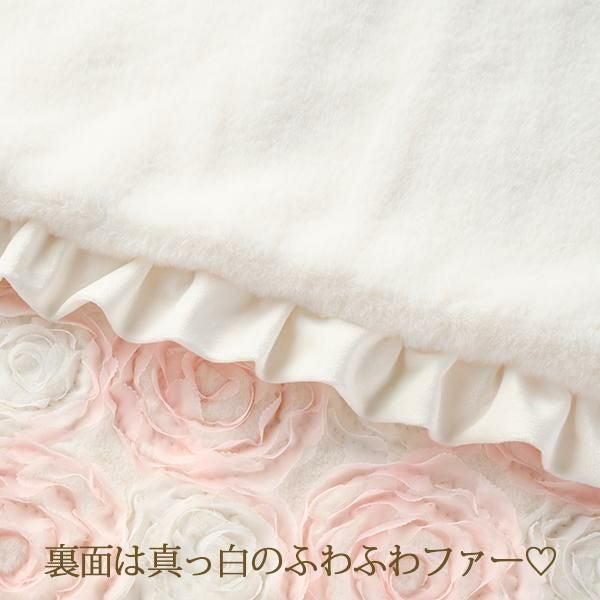 ふわふわ柔らかな手触りの生地にシフォンリボンで描かれた立体感のあるローズ刺繍が、ブランケット全面に広がる愛らしいデザイン。ホワイトと淡いピンクの優しい色合いが、お部屋にふんわりとした可憐なムードをプラスします。周囲にはスウェードタッチの生地でたっぷりのフリルをあしらい、乙女心をくすぐる可憐なデザインに仕上げました。裏面はホワイトのラビットタッチファーでずっと撫でていたくなるような触り心地。気分に合わせて2wayで楽しめます。ブランケットとしてはもちろん、インテリアのアクセントや写真映えアイテムとしてもおすすめです。シリーズで揃えれば、お部屋全体がロマンティックな空間に早変わり♪