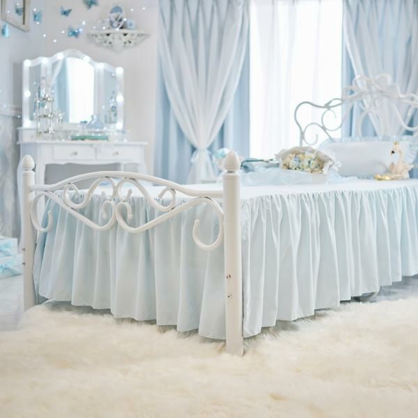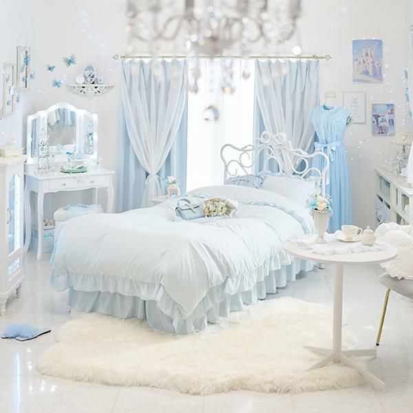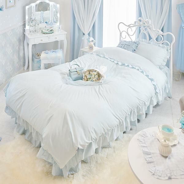 主張しすぎないフリルがスイートで可愛い、優しく淡い水色ワントーンの布団カバーセット。柔らかなピーチスキンのような微起毛生地はしっとりと肌に馴染むのに、サラっとした肌触り。ポリエステル素材はしわになりにくいので取り扱いもしやすくオールシーズン使用可能です。掛けカバーの衿元とピローケースの周囲にはたっぷりとしたフリルをあしらい、可愛いらしさをプラス。ベッドシーツはスカート付きで、コーナーにはスリットが入っているので綺麗なフリルでベッド下の目隠しが叶います。オールブルーなので、かわいいお部屋作りのポイントに♪