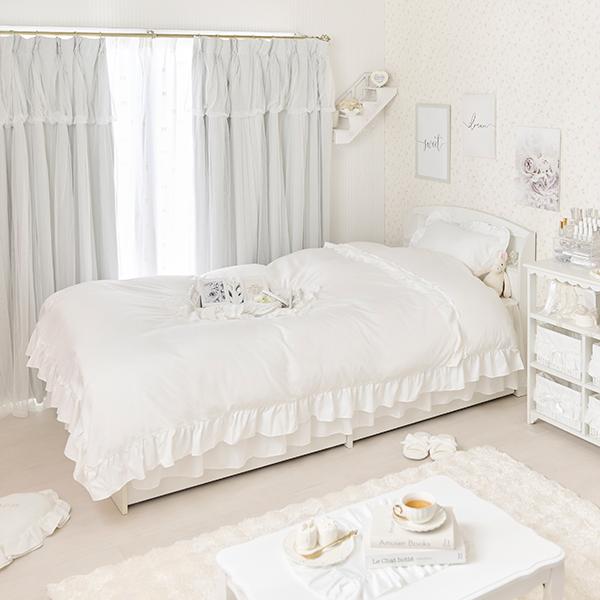 掛けカバーの衿元とピローケースの周囲にはたっぷりとしたフリルをあしらい、可愛いらしさをプラス。ベッドシーツはスカート付きで、コーナーにはスリットが入っているので綺麗なフリルでベッド下の目隠しが叶います。