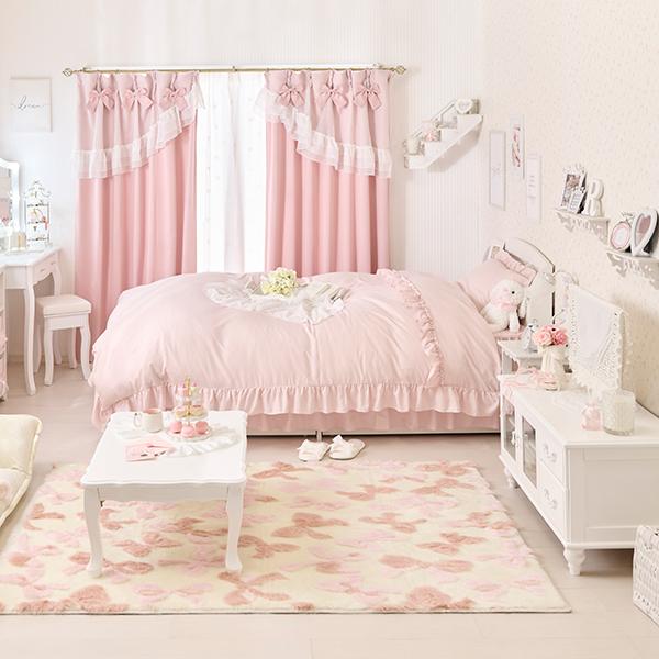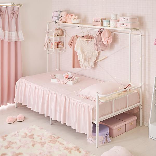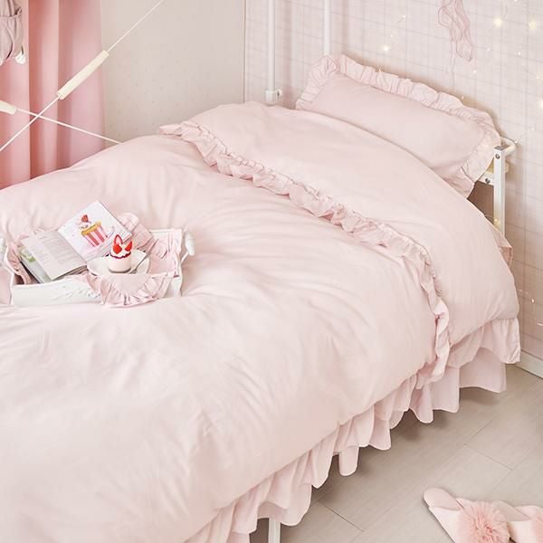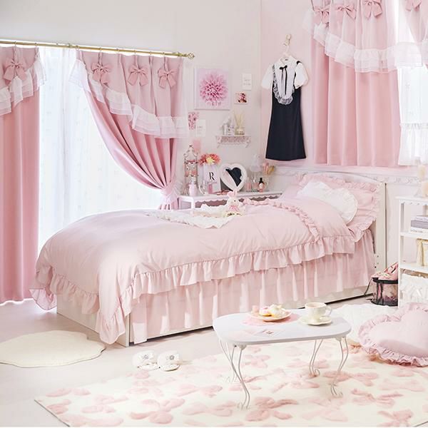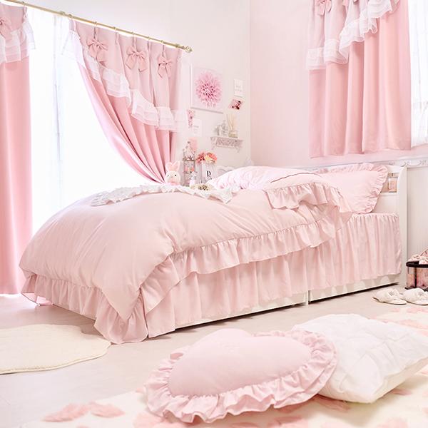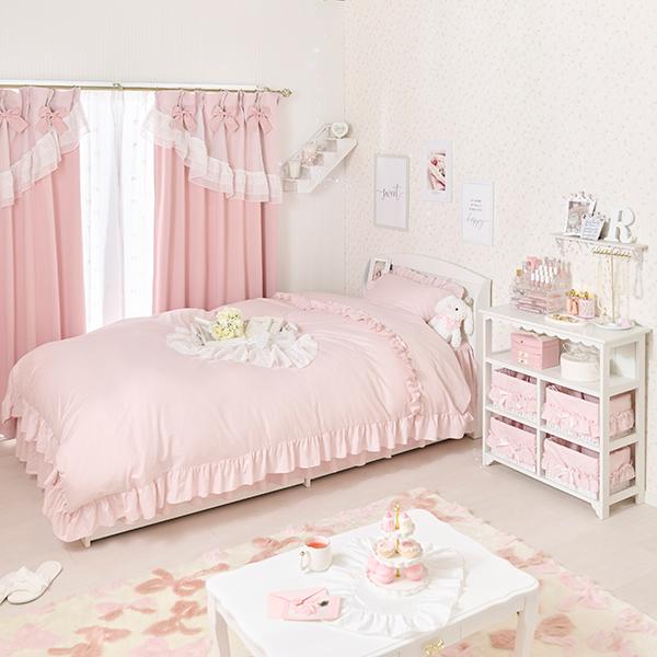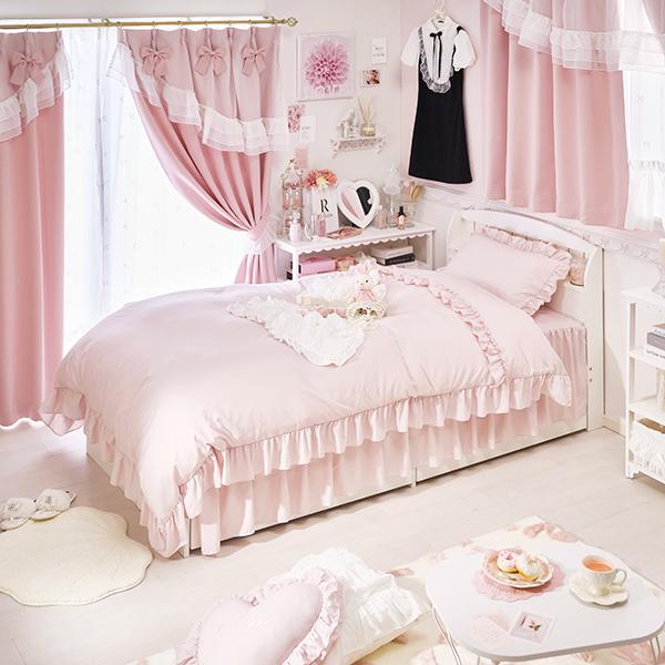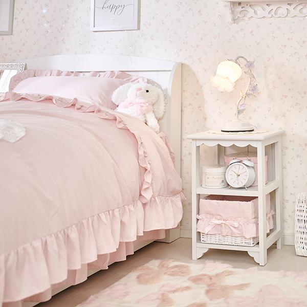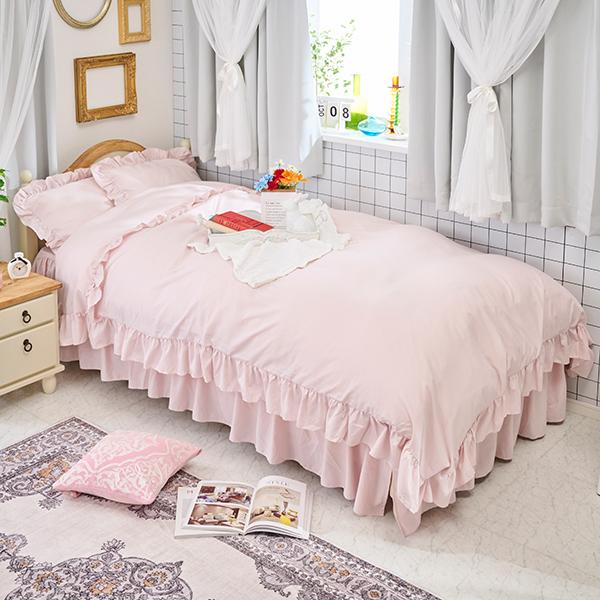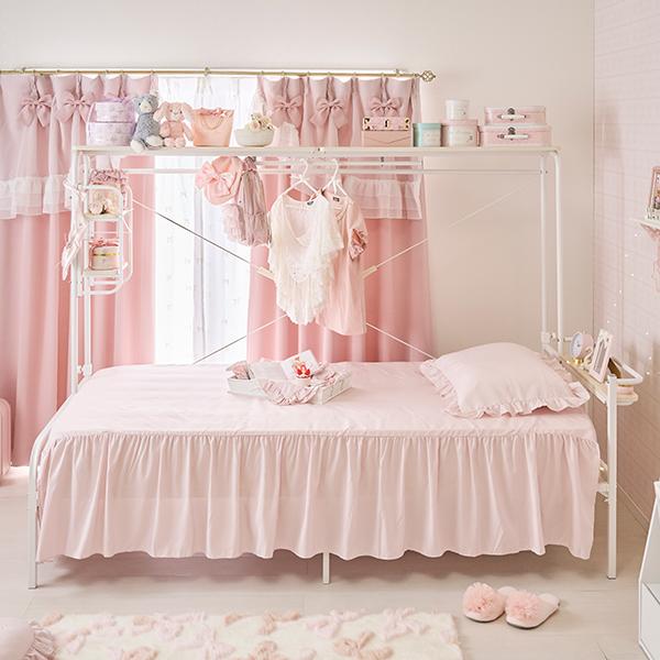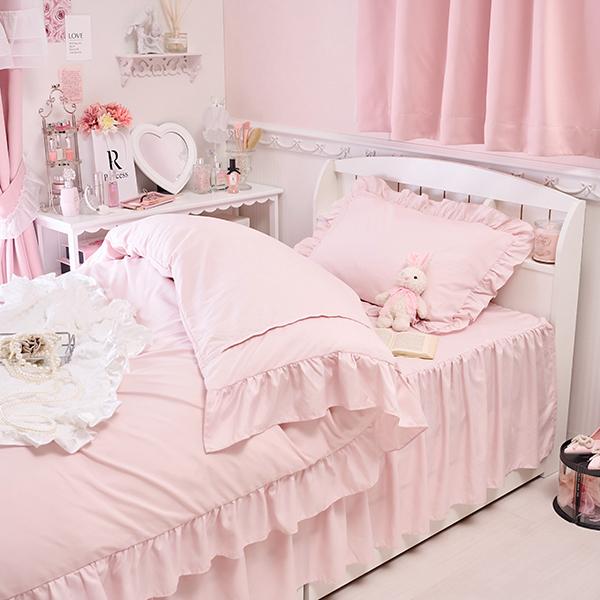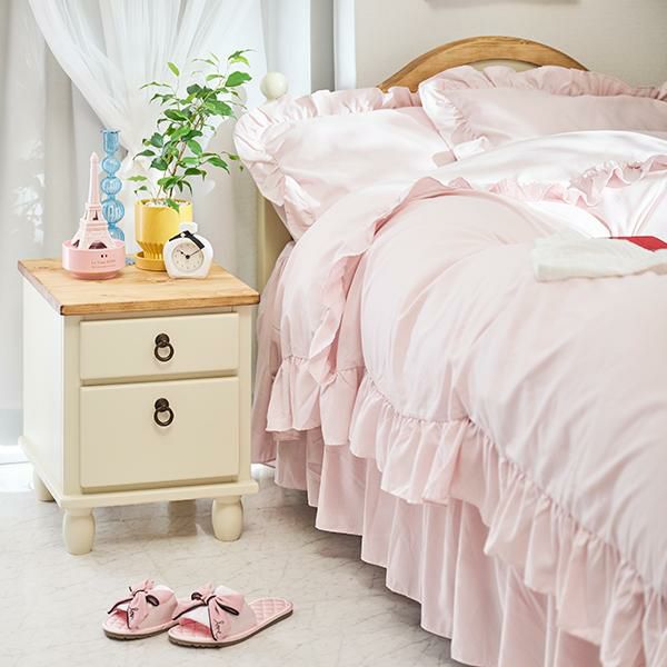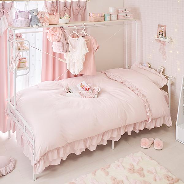掛けカバーの衿元とピローケースの周囲にはたっぷりとしたフリルをあしらい、可愛いらしさをプラス。ベッドシーツはスカート付きで、コーナーにはスリットが入っているので綺麗なフリルでベッド下の目隠しが叶います。