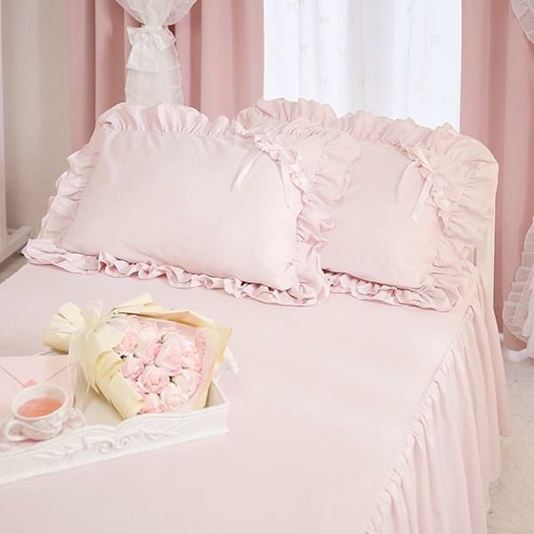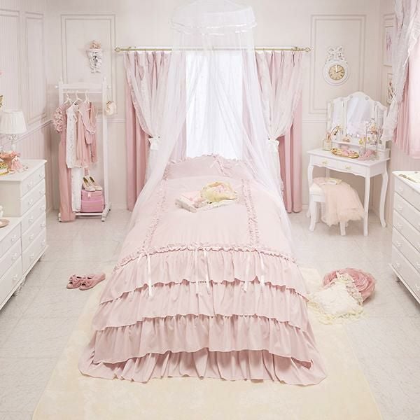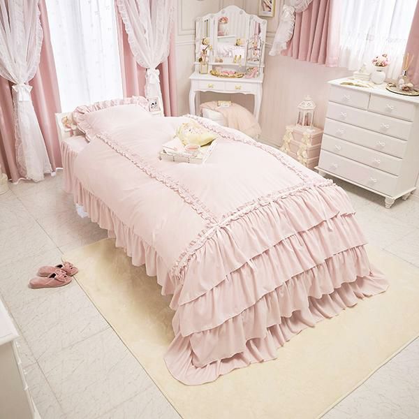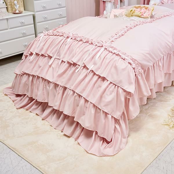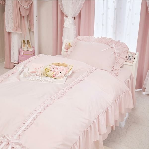 枕カバーは周囲にたっぷりの2段フリルをあしらい、コーナーにプチフリルと同色のサテンリボンを合わせました。掛け布団カバーには、ミルフィーユを思わせるような4段ティアードフリルと3本のプチフリルにリボンをプラスし、ラグジュアリーなムードに。リボンは結んでいただく仕様なので、お好みの形にしていただけます。ベッドシーツはスカート付きで、コーナーにはスリットが入っているので綺麗なフリルでベッド下の目隠しが可愛く叶います。