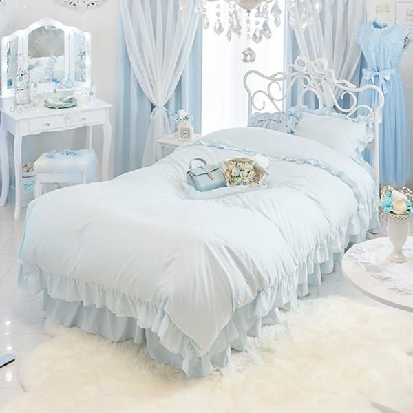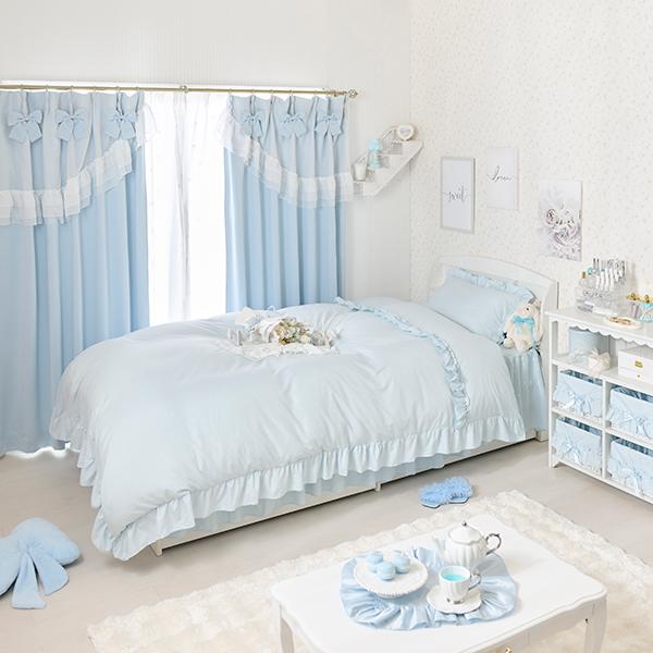 主張しすぎないフリルがスイートで可愛い、優しく淡い水色ワントーンの布団カバーセット。柔らかなピーチスキンのような微起毛生地はしっとりと肌に馴染むのに、サラっとした肌触り。ポリエステル素材はしわになりにくいので取り扱いもしやすくオールシーズン使用可能です。掛けカバーの衿元とピローケースの周囲にはたっぷりとしたフリルをあしらい、可愛いらしさをプラス。ベッドシーツはスカート付きで、コーナーにはスリットが入っているので綺麗なフリルでベッド下の目隠しが叶います。オールブルーなので、かわいいお部屋作りのポイントに♪