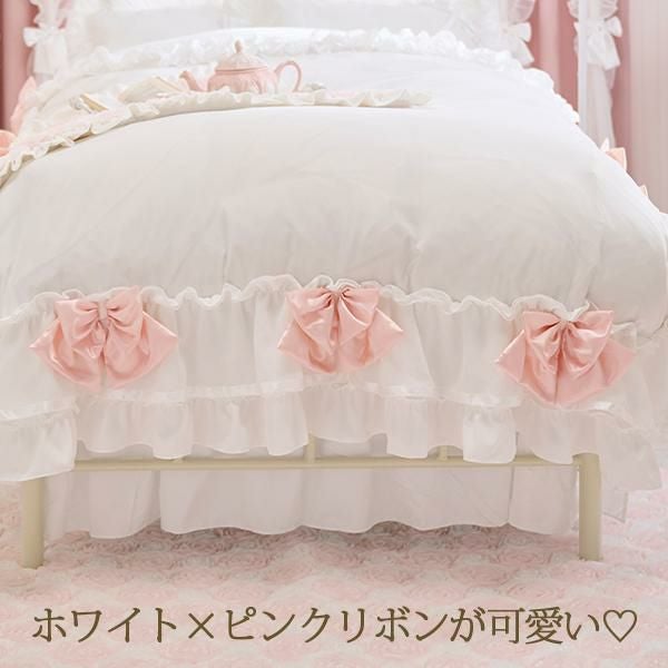 ふわりと広がるフリルに、大きなピンクのリボンがリズミカルに並ぶ、上品で愛らしいカバーリングセット。まるでラッピングされた贈り物のような可憐なデザインは、お部屋を一瞬でロマンティックな空間に変えてくれます。