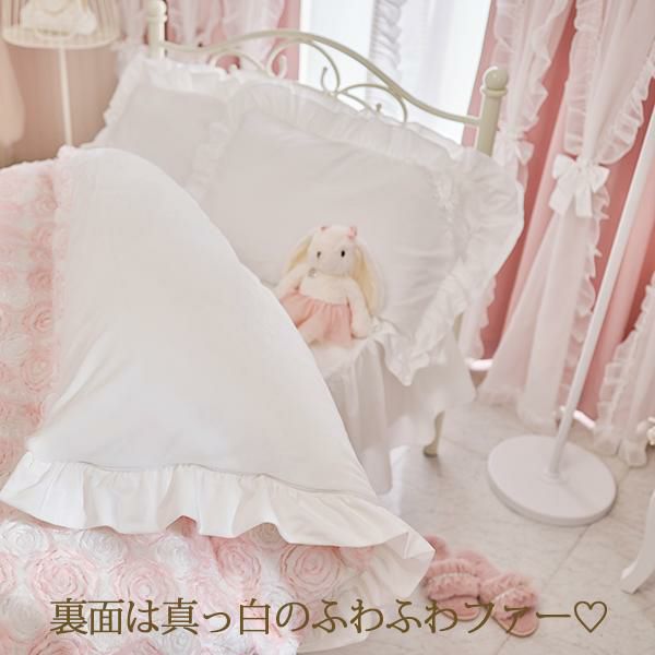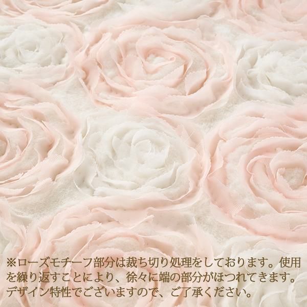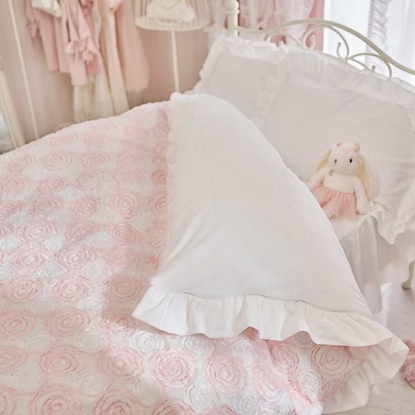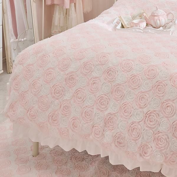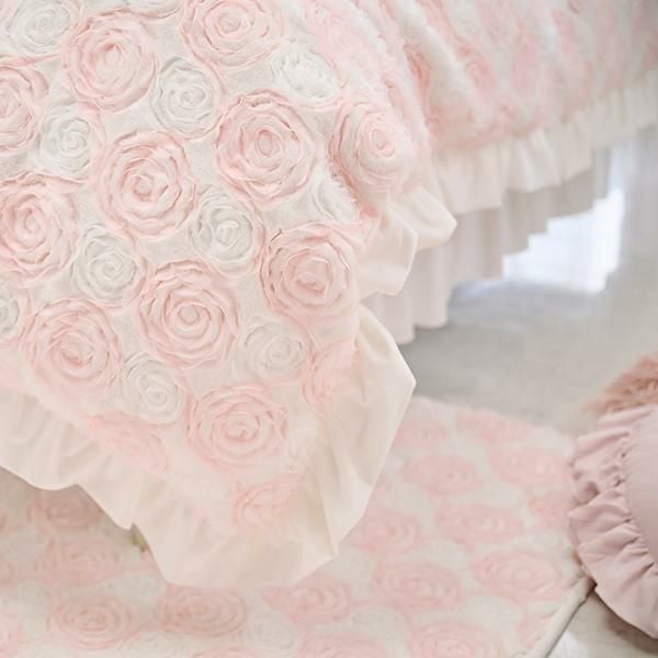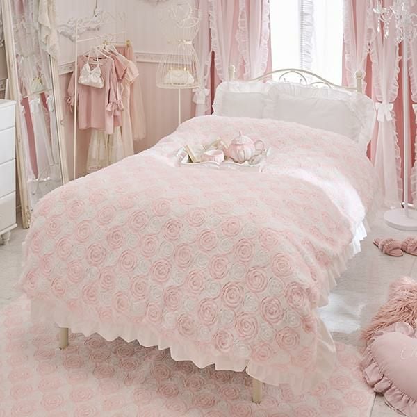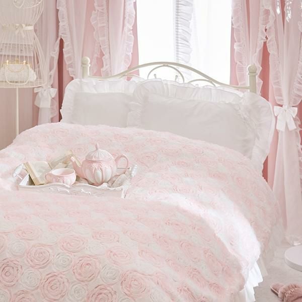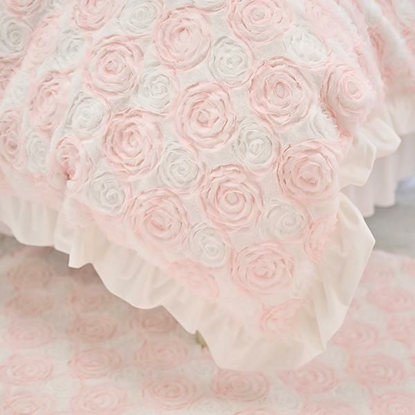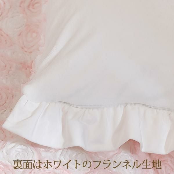ふわふわ柔らかな手触りの生地にシフォンリボンで描かれた立体感のあるローズ刺繍が、カバーリング全面に広がる、まるで花畑のような愛らしいデザイン。ホワイトと淡いピンクの優しい色合いが、お部屋にふんわりとした可憐なムードをプラスします。周囲にはスウェードタッチの生地でたっぷりのフリルをあしらい、乙女心をくすぐる可憐なデザインに仕上げました。裏面はホワイトのフランネル生地で、しっかりとした重みがあり、暖かくぐっすり眠れそう。そのまま毛布としてもご使用いただけます。掛け布団カバーとしてはもちろん、インテリアのアクセントや写真映えアイテムとしてもおすすめです。シリーズで揃えれば、お部屋全体がロマンティックな空間に早変わり♪