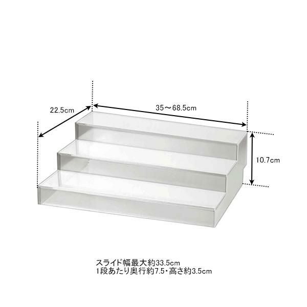 広げて使えるマルチ棚。保管・陳列に効果バツグンです。道具を使わず横幅がスライド調節できるので、どこでもぴったり納まります。ひな段状になっているので奥の小物も並べて飾れます。