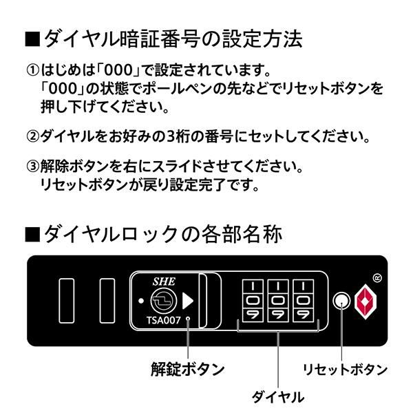 セキュリティー面では、ダイヤル式のTSロックを採用しているので、鍵を持ち歩く必要や、鍵を紛失する心配もないので、大切な旅行を思いっきり楽しんでいただけます。