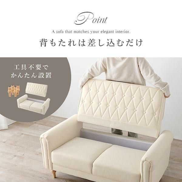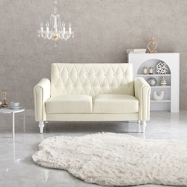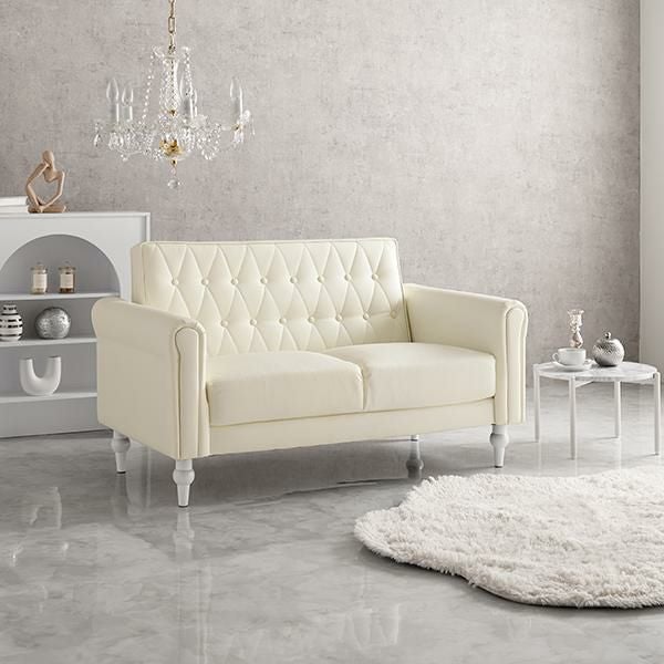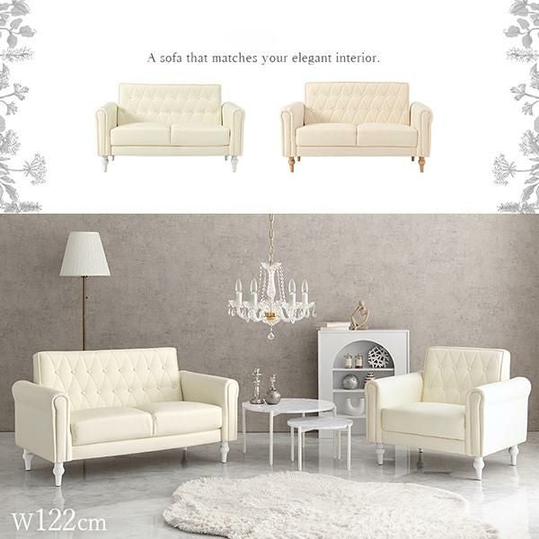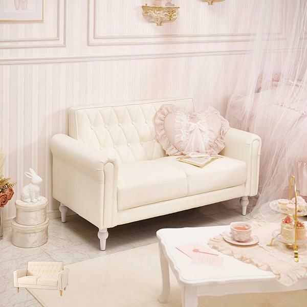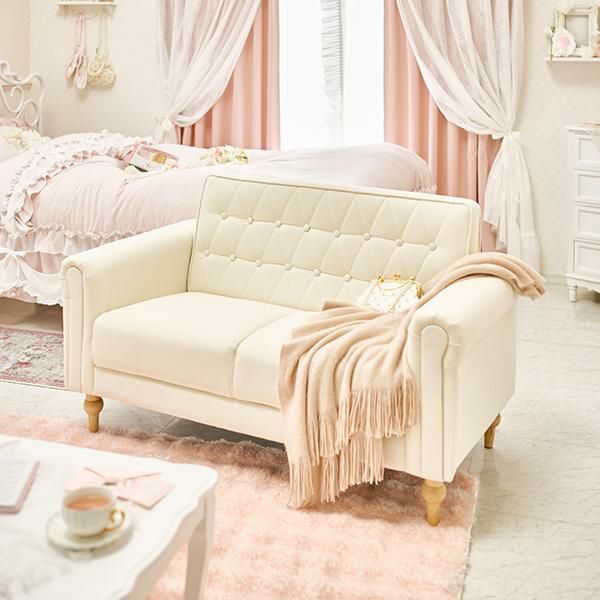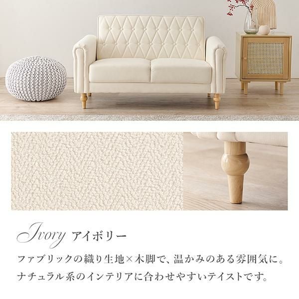上品さと可愛らしさを掛け合わせた2人掛けソファ。キルティングやころんと丸い肘掛けなど、細部までデザインをこだわり、生地には高級感のあるクロスボタンステッチを施しました。
