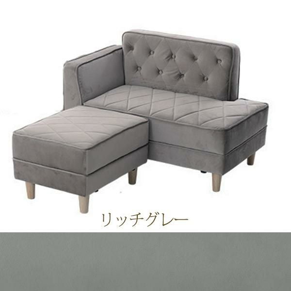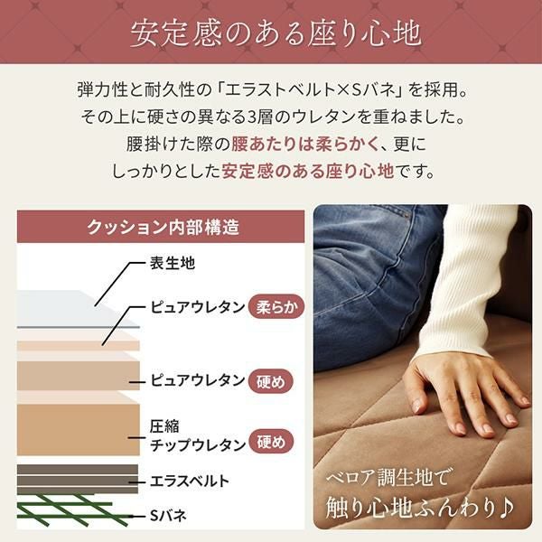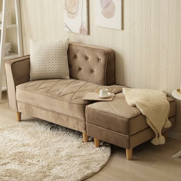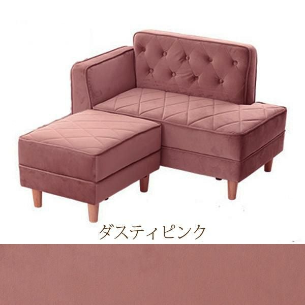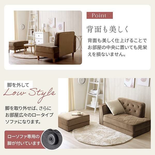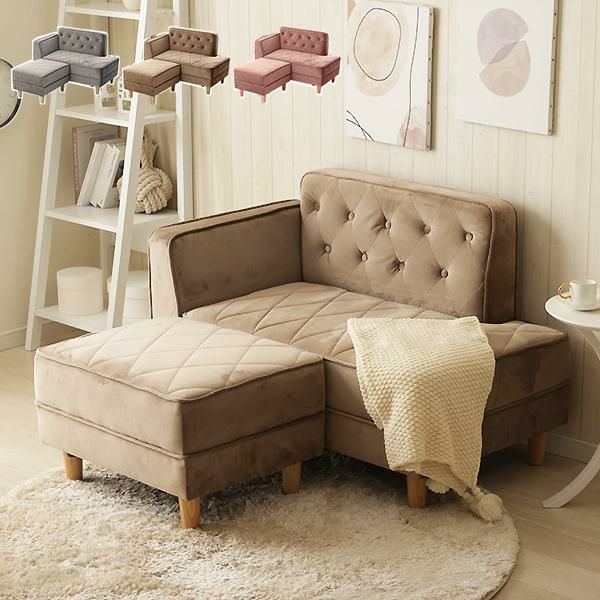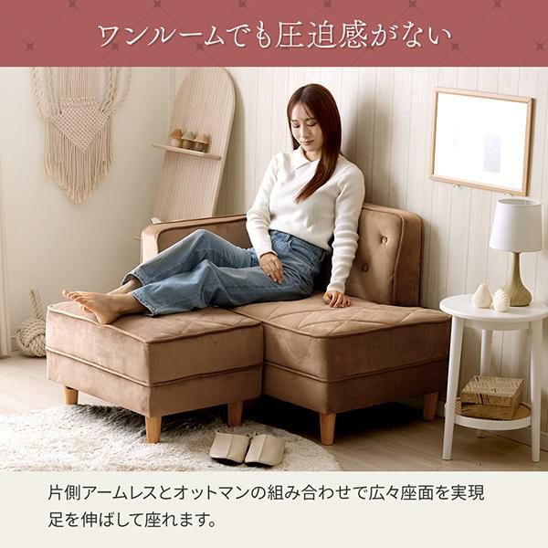 片側アームレスと、オットマンの組み合わせで広々座面を実現。ワンルームでも圧迫感なく、足を伸ばして座れます。キルティング×ベロア調の生地が高級感溢れ、かわいいお部屋に。3層のウレタンを重ねた座面は、腰かけた際の腰あたりは柔らかく、しっかりとした安定感のある座り心地です。背面も美しく仕上げることで、お部屋の中央に置いても見栄えを損なわず、また脚を取り外してロータイプソファとしても使えます。間取りや来客時になどに合わせて、自由にスタイルを変えて自分だけのレイアウトを楽しめます♪