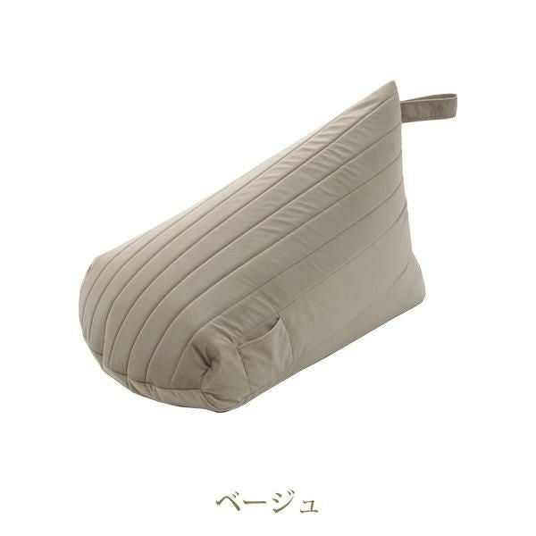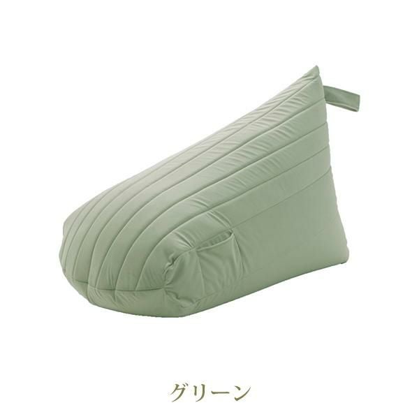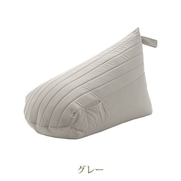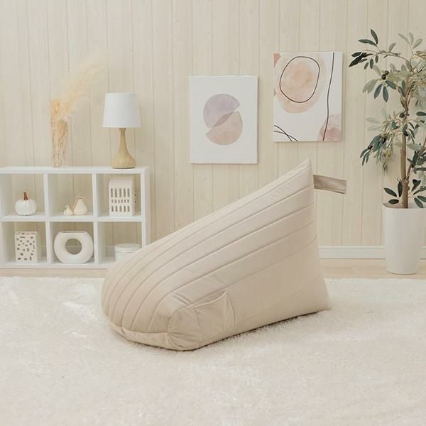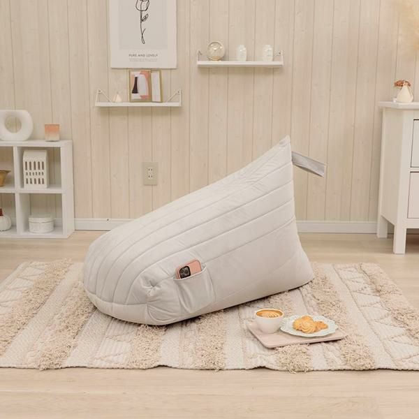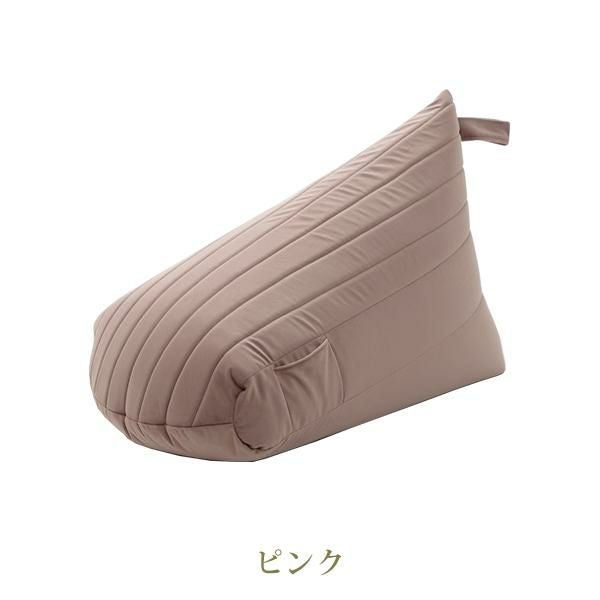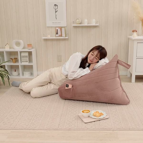 三角の型で身体にしっかりフィットして、背もたれができるのでいろんな姿勢で楽にくつろげます。従来のビーズクッションに比べてヘタリにくい仕様になっています。スマホなどを入れるのに便利なポケット付。