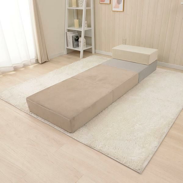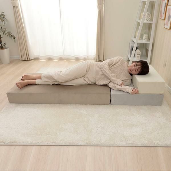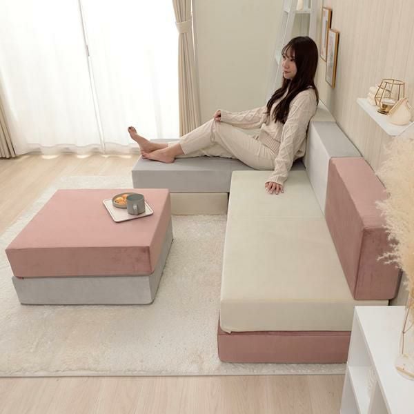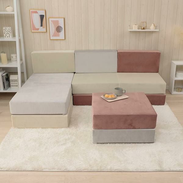 大人可愛いベロアのくすみカラーを積み木のようなブロックソファーにしました。