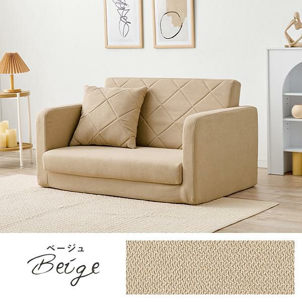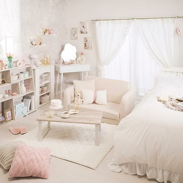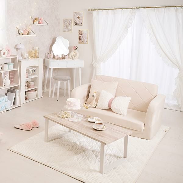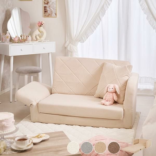 枕代わりにも使えるキルティングがお揃いのクッション付き。ミルキーな淡色カラーでほんのり甘すぎない可愛いお部屋に。