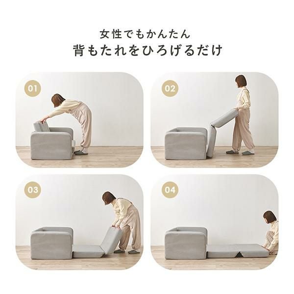 「しっかりくつろぎたい時」には座面を広げるとベッドに変身!一見ソファに見えるけど、座面を広げると簡易ベッドに。お背もたれを伸ばすだけなので、力を加えることなく簡単に変形できます。