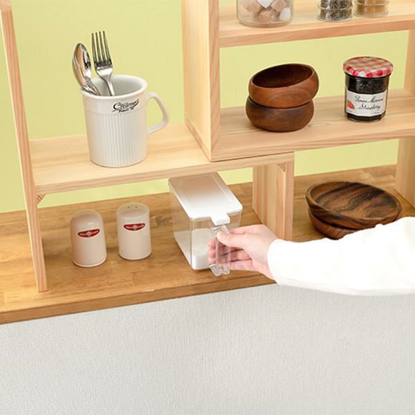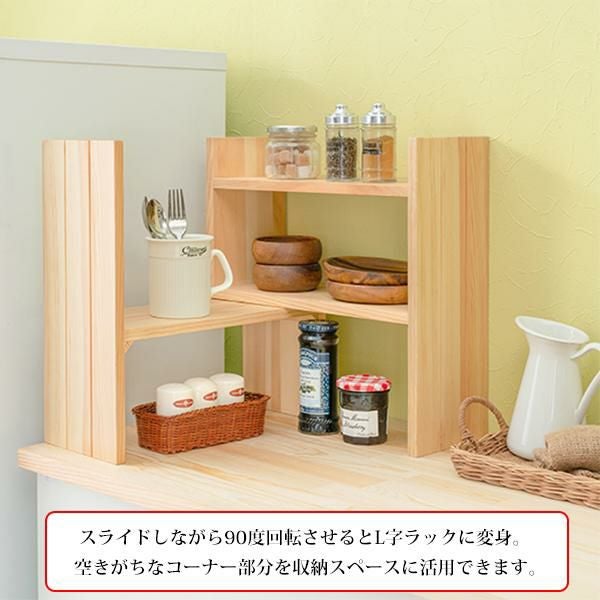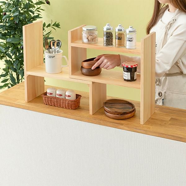 場所に合わせて伸縮可能なスパイスラック。天然木のぬくもりを感じられます。