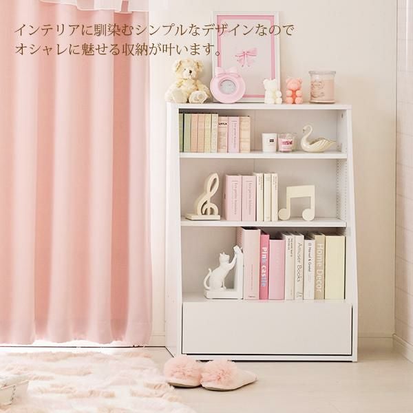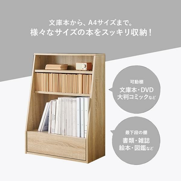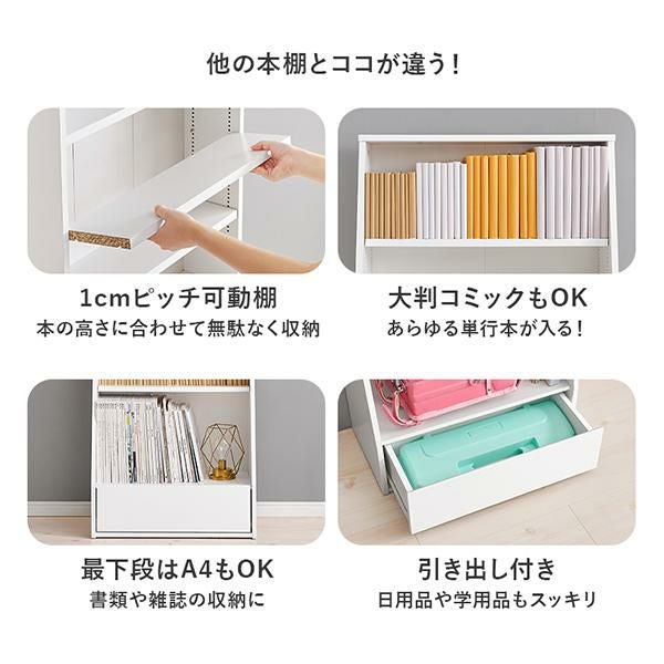 1cm刻みで棚板高さが調節できるので、本の高さに合わせて無駄なく調節できます。下に行くほど奥行が広くなっており、一番下には小物も収納できる引き出し付き。ごちゃつきがちな日用品などもきちんと収納できます。