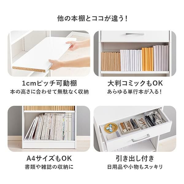 文庫本から、A4サイズまで様々な本をすっきり収納。可動棚を取り外すと更に棚全体を広く使えます。