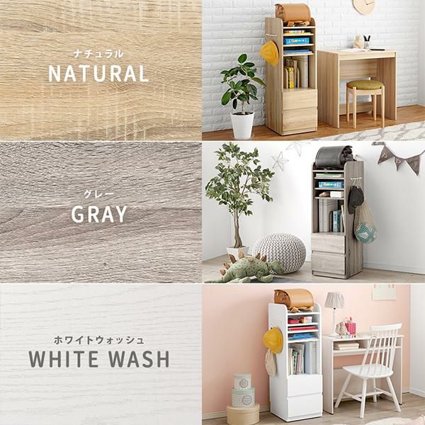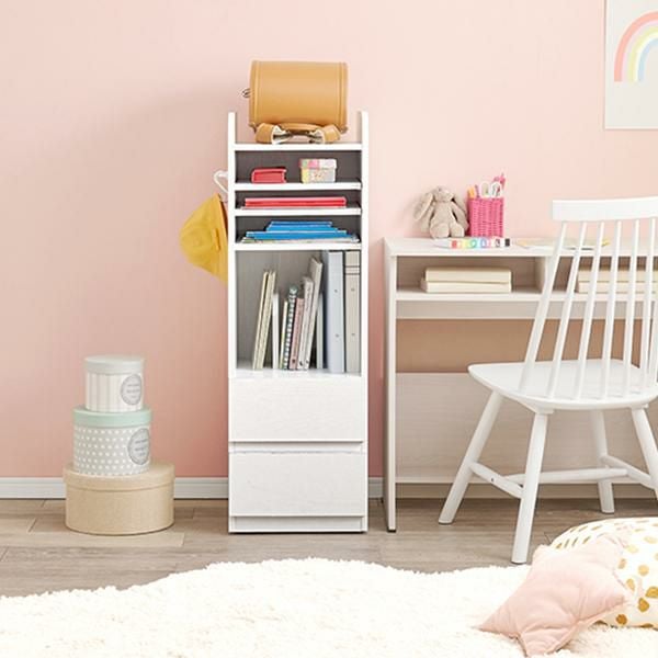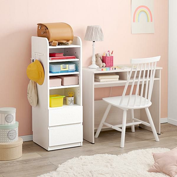 3cmピッチで調節できる可動棚付き。サイドフックは左右どちらでも取り付けでき、S字フックが2個付いています。A4フラットファイルが入る引き出しはスライドレール付きでお子様でも開閉がスムーズ。