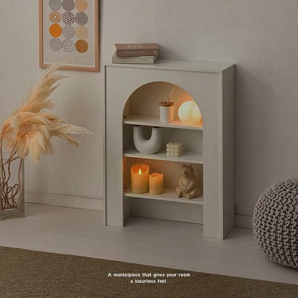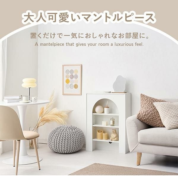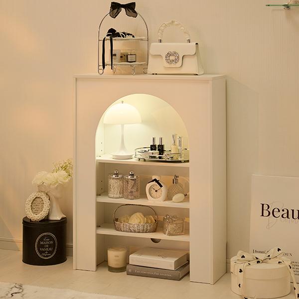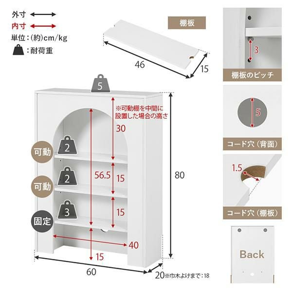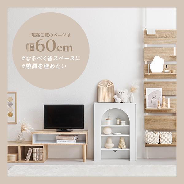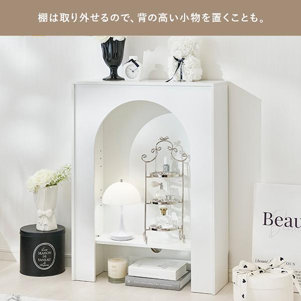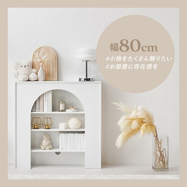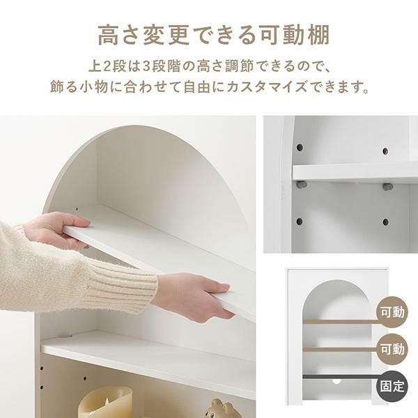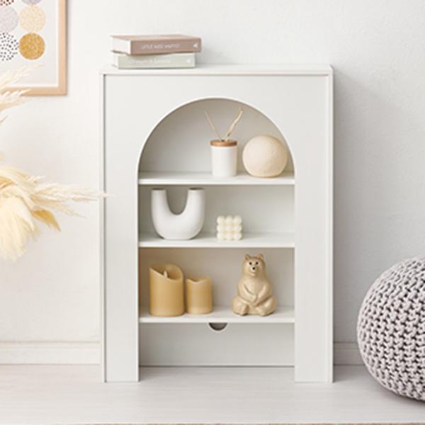 どんなシーンにも合わせやすいシンプルだけどかわいい&細部にまでこだわったデザイン。つい眺めたくなる可愛いアーチ型は、上段2段が可動棚なので、棚板を取り付けず背の高い小物を収納することもできます。スリムな奥行20cmで圧迫感を感じにくく、一人暮らしやワンルームにもオススメ。巾木避けがあるので、壁にぴったりと設置できます。