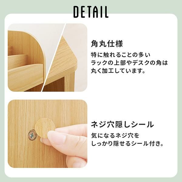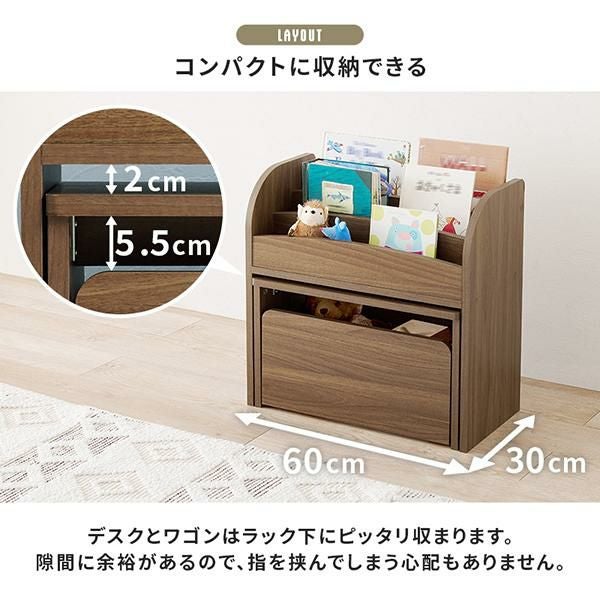 ラックはお子様が絵本を見つけて取り出しやすい高さ設計で、お子様の「できた!」をサポートします。仕切りの高さが少しずつ高くなっており、収納場所に困りがちな大きいサイズの本もスッキリ収納。遊び終わったおもちゃはワゴンにポイポイ入れるだけでお片付け完了。キャスター付きなので重たいおもちゃも楽に移動できます。更にサッと引き出して使えるミニデスクも付いているので、ちょっとしたキッズスペースがすぐに完成します!