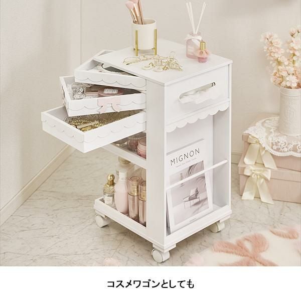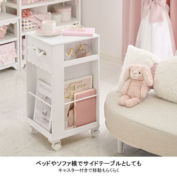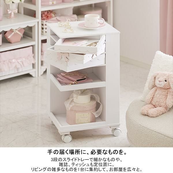 3段のスライドトレイで小物を見やすく整頓。雑誌やティッシュを置けるスペースもありまとめてスッキリ収納。キャスター付きだからスッと移動できます。ソファやベッド横などどこに置いても空間に溶け込むシンプルデザインです。コスメワゴンとしても。