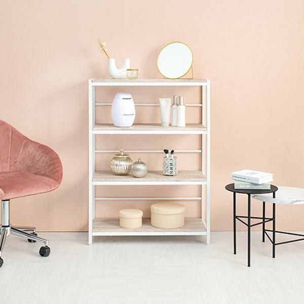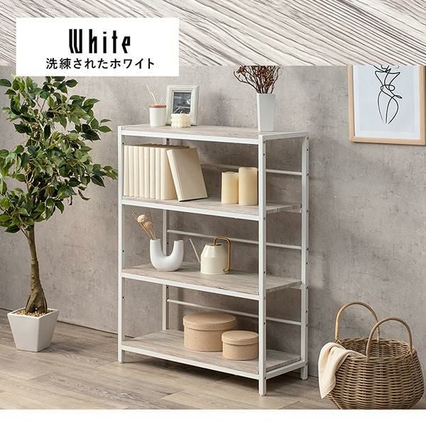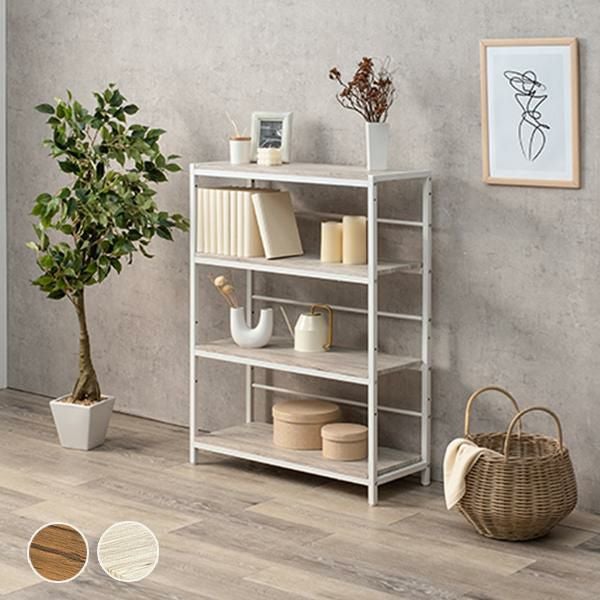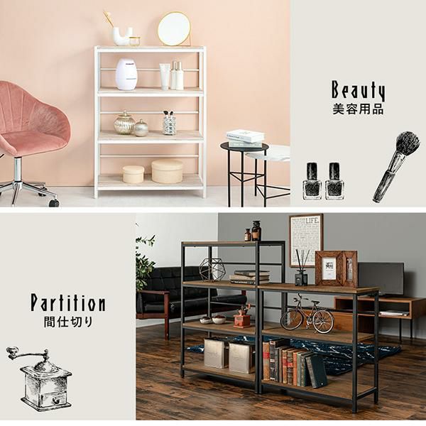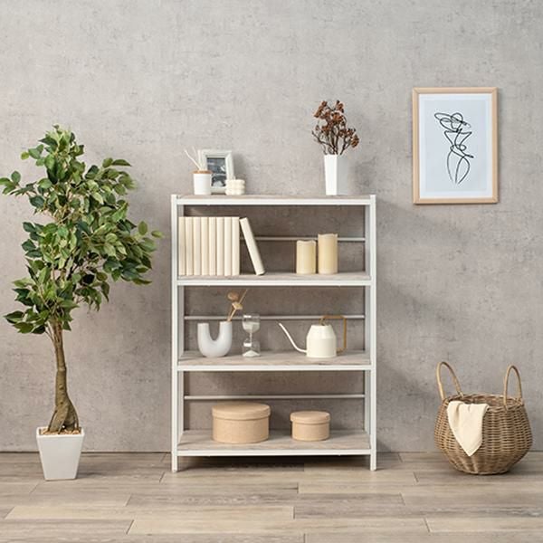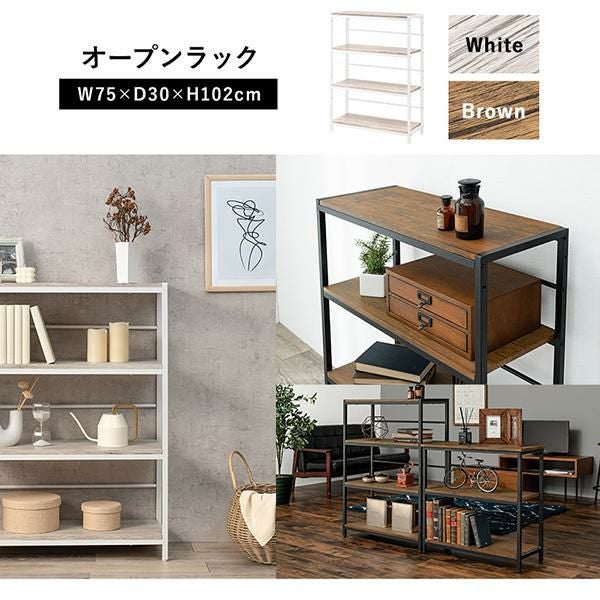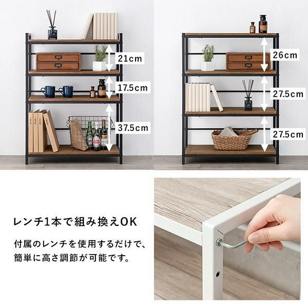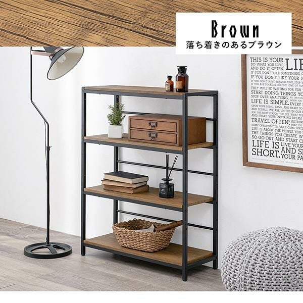 木目調の棚板にアイアンフレームを合わせたシンプルな4段オープンラック