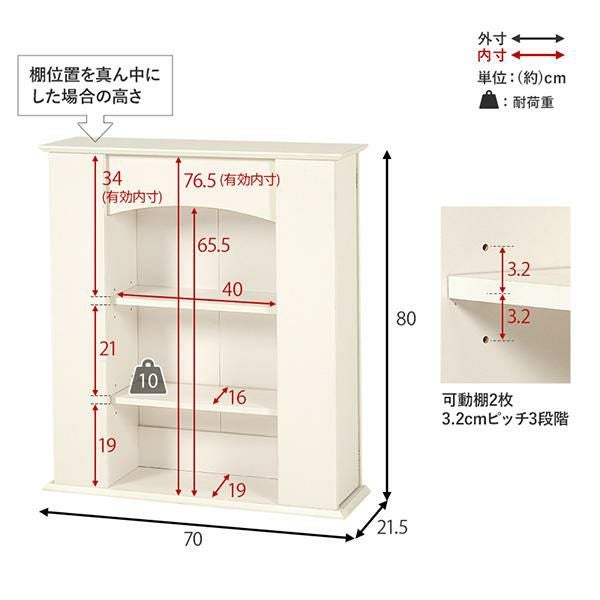 フロント収納は3.2cm間隔で3段階に調節できるので、高さの異なるアイテムも可愛くディスプレイでます。棚板はすべて取り外せるので大きな雑貨もOK。