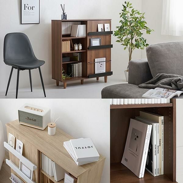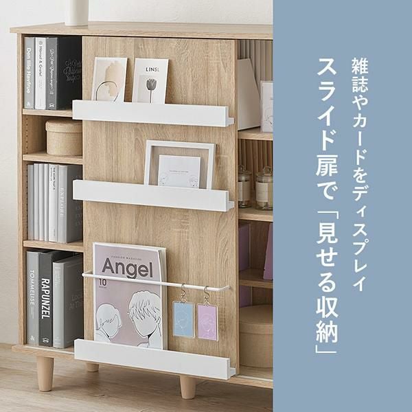 雑誌やカードをかわいくディスプレイしながら、スライド扉で「見せる収納」を実現!前後に分割できる棚板の仕様なので、コミック本なら約400冊収納可能です。扉前板にはカードやミニポスター、S字フックでキーホルダー飾るのも♪自由に飾って、わだしだけのスペース作りが叶います。