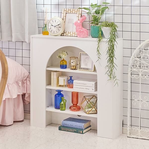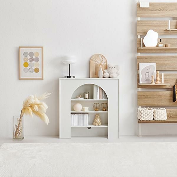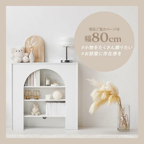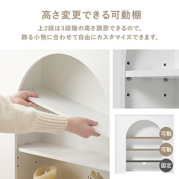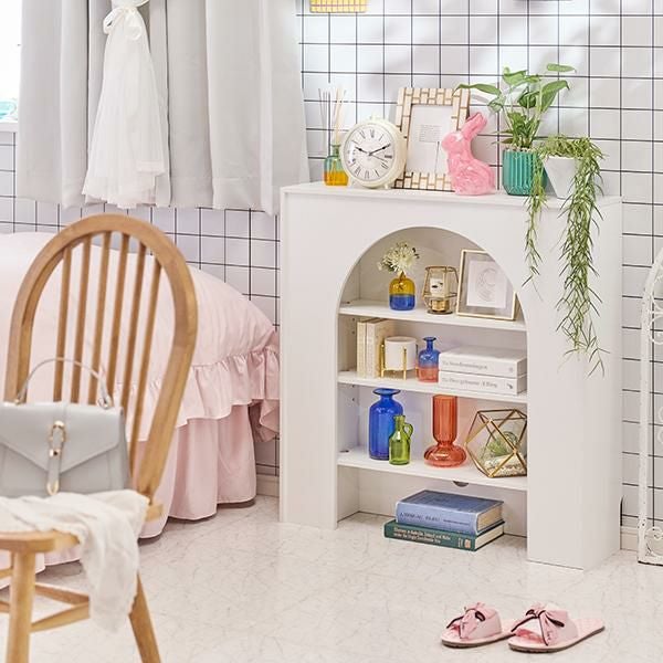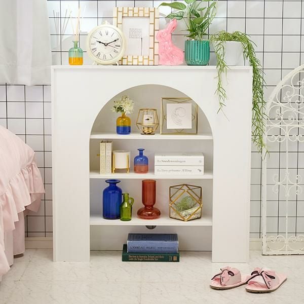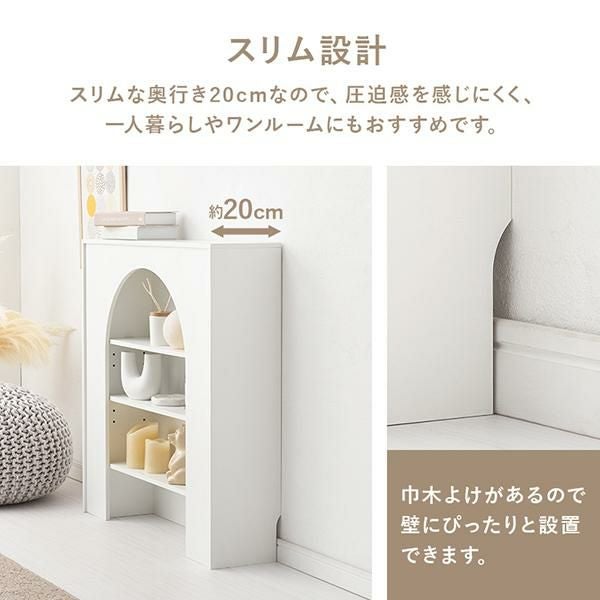 どんなシーンにも合わせやすいシンプルだけどかわいい&細部にまでこだわったデザイン。つい眺めたくなる可愛いアーチ型は、上段2段が可動棚なので、棚板を取り付けず背の高い小物を収納することもできます。スリムな奥行20cmで圧迫感を感じにくく、一人暮らしやワンルームにもオススメ。巾木避けがあるので、壁にぴったりと設置できます。