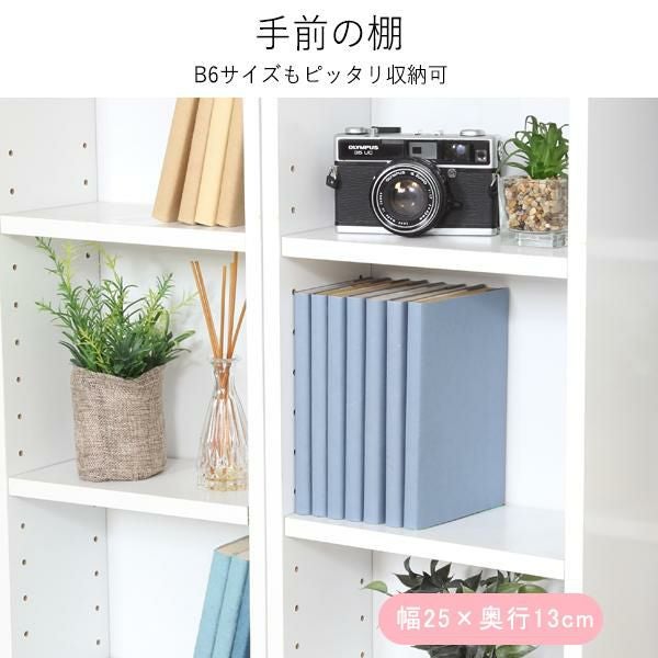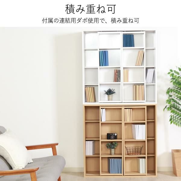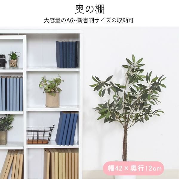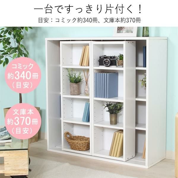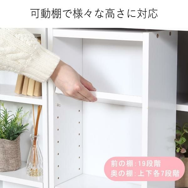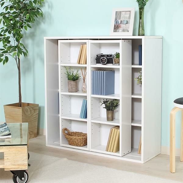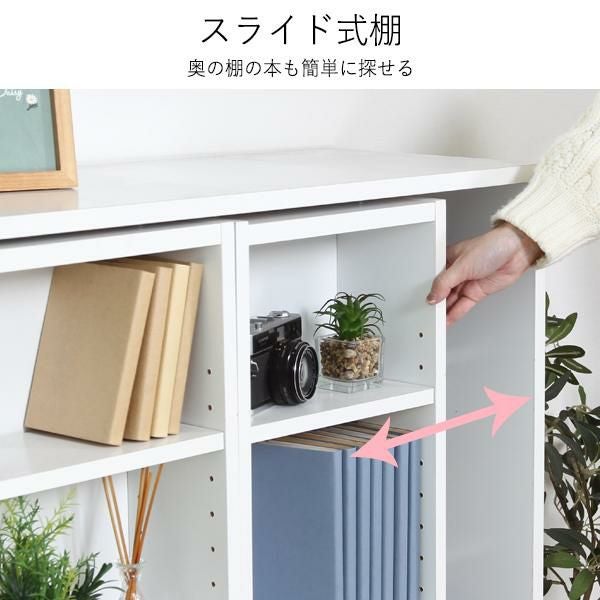 奥の本が取り出しやすい左右スライド設計。前後で異なる奥行と細かな可動棚により、文庫本等を効率良く収納可。連結金具で2段に重ねれば、限られたスペースで収納力が倍増に。