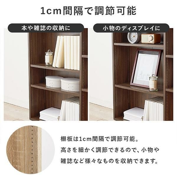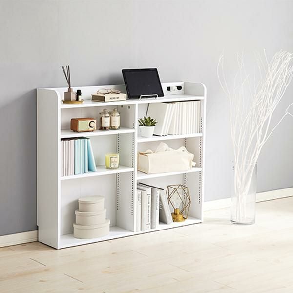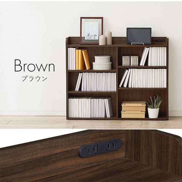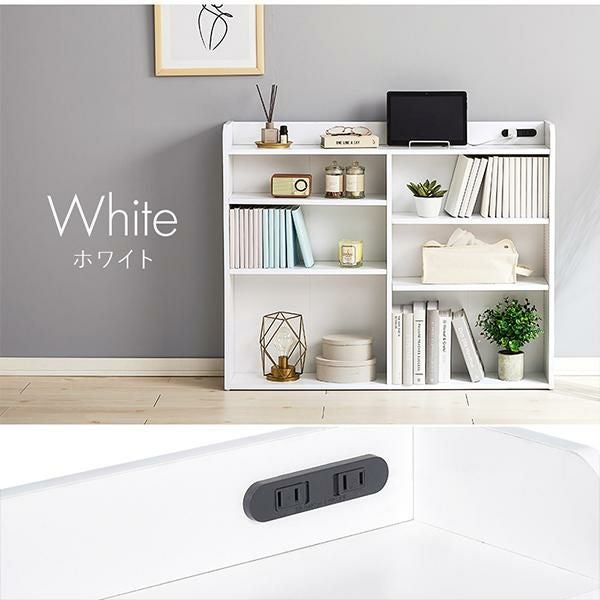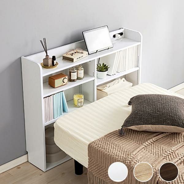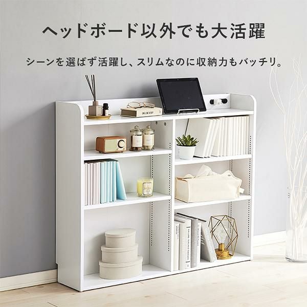 天板には小物を置けるスペースを確保しているので必要な時にサッと手に取れます。棚板は1cm間隔で調節可能で高さを細かく設定できるので、小物や雑誌など様々なものを収納できます。宮棚には2口コンセントが付いており、スマホの充電などに便利。巾木を避けるカットを施しているので、壁に隙間なく設置できるのが嬉しい!