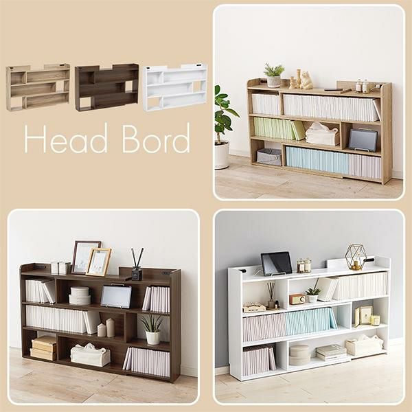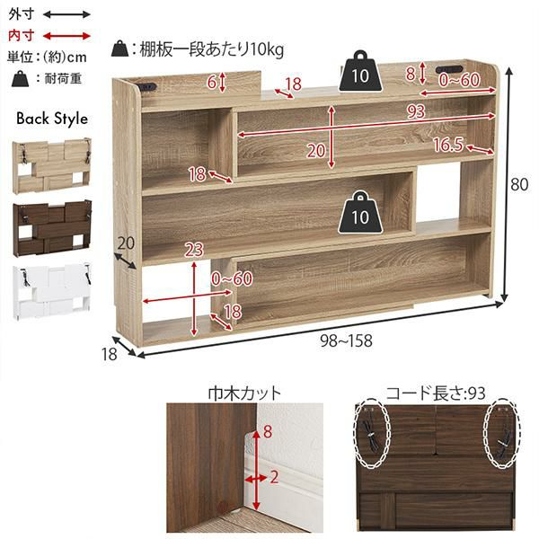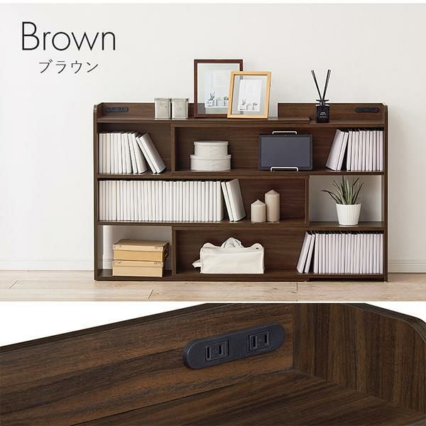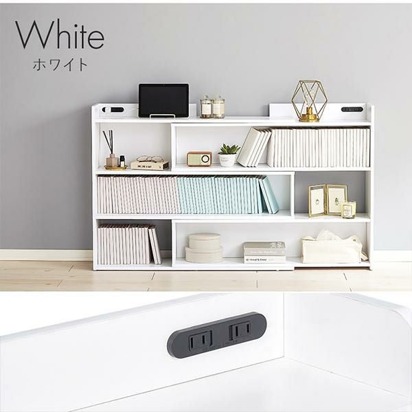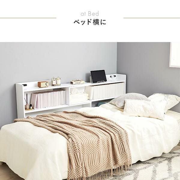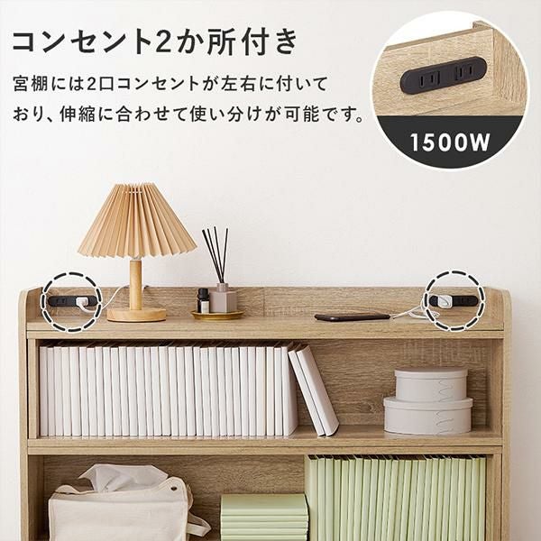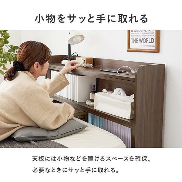 天板には小物を置けるスペースを確保しているので必要な時にサッと手に取れます。棚板は1cm間隔で調節可能で高さを細かく設定できるので、小物や雑誌など様々なものを収納できます。宮棚には2口コンセントが左右に付いており、スマホの充電などに便利。巾木を避けるカットを施しているので、壁に隙間なく設置できるのが嬉しい!