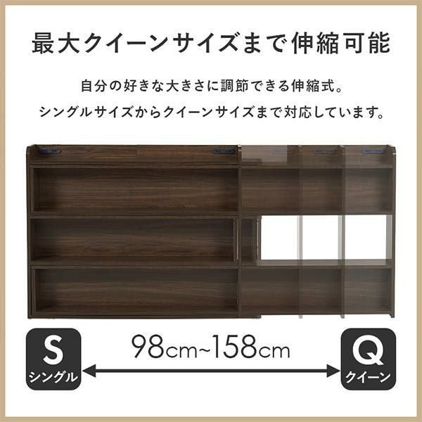 自分の好きなサイズに調節できる伸縮式でシングル~クイーンサイズまで対応。ベッドフレームに合わせて使いやすい高さに設計され、マットレスを置いても収納棚がすべて隠れないのでお部屋のイメージチェンジも叶います。