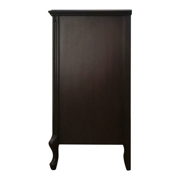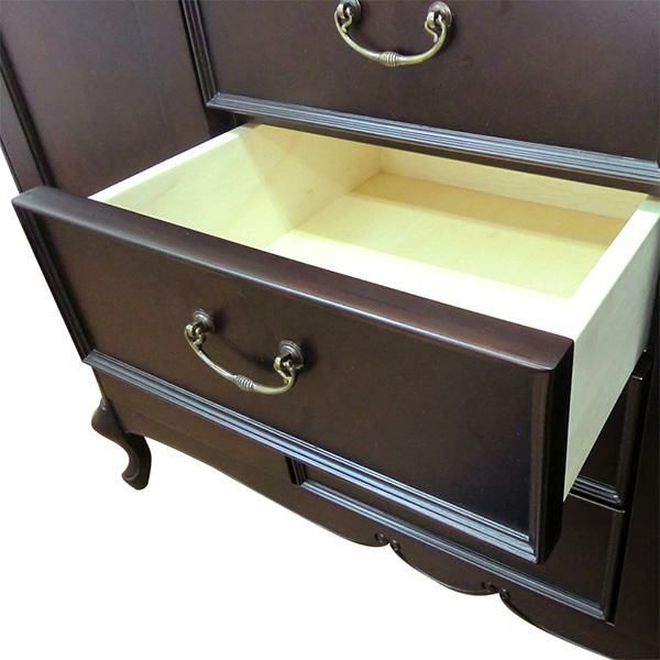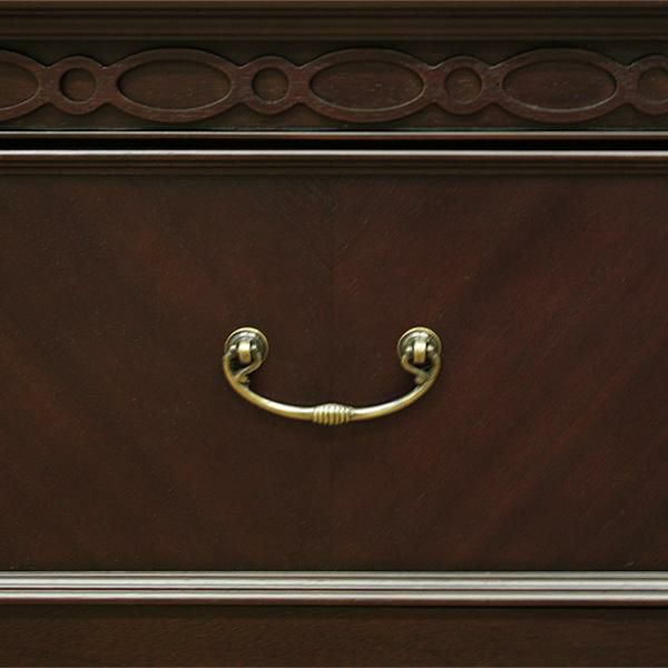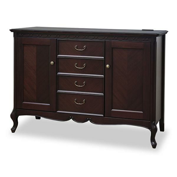 18世紀、ルイ15世時代のフランス宮廷から始まり、貴族の宮殿や上流階級のご婦人を中心に流行した、直線を排した軽快で華麗なフランス・サロン文化を彩る装飾様式だったロココ調家具のエッセンスを残したフレンチカントリースタイルを、よりカジュアルに実用的なアイテムでセレクトしたトータルコーディネートシリーズです。マホガニー材を贅沢に使い、表面は厳選された木目を使った化粧張りを施し、フレンチエレガンスの代名詞といえる「カブリオールレッグ」(猫脚)と、なめらかな女性的な美しいラインとマホガニー無垢材を削り出した彫刻が特徴です。