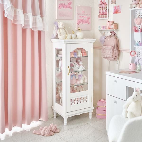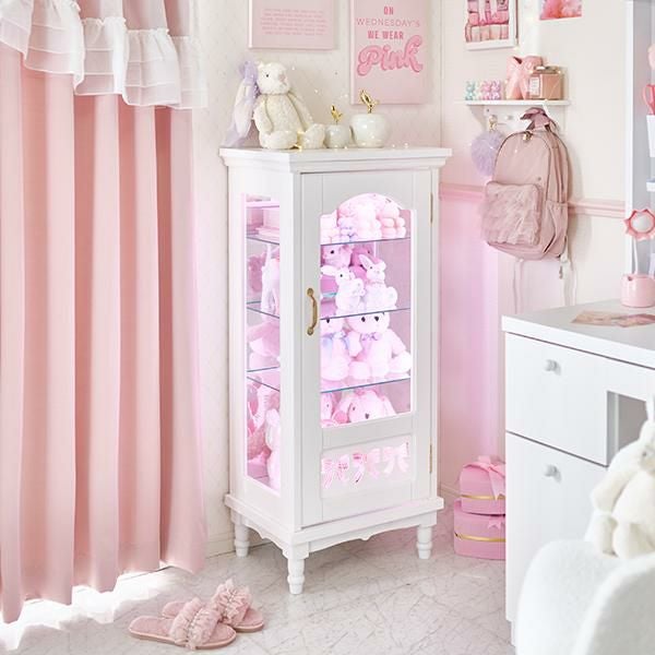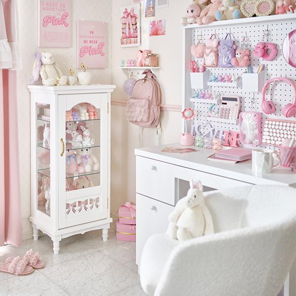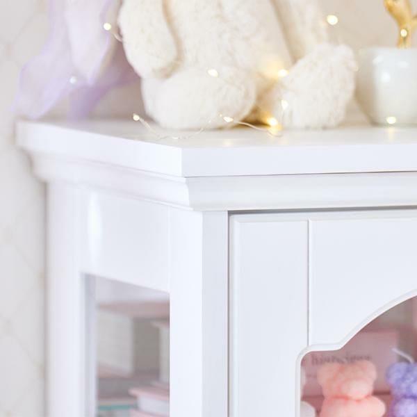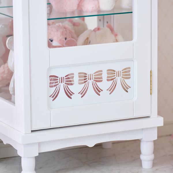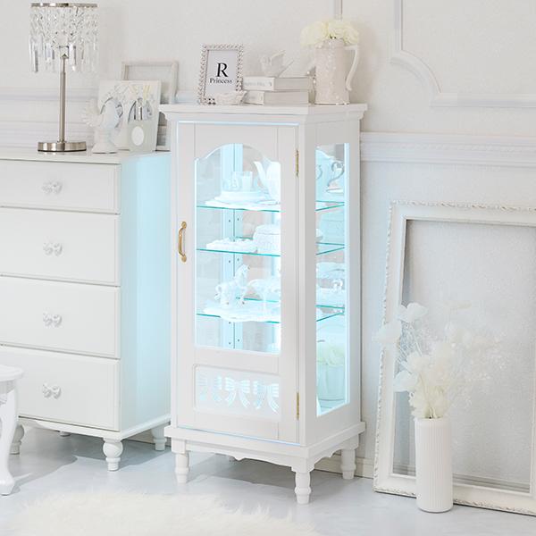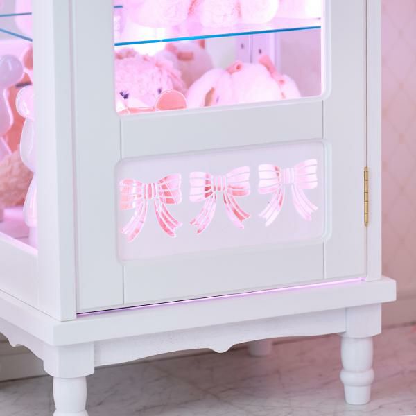 カラフルにライティングできるLEDライト付きのガラスキャビネット。付属のコントローラーで色味や彩度を調整し、好みのカラーに変更可能で、明るさや光り方などの調整できます。棚板は高さ調整も可能なガラス製で、背面もミラー仕様で高級感があり、ディスプレイ映えする仕様になっています。推しカラーでディスプレイしたりと、推し活がより一層楽しめる究極の推し活キャビネットです。また消灯時でも、ホワイトクラシカルな佇まいで、ロマンティックテイストなお部屋にも馴染むデザインとなっています。1つ1つが国内生産で丁寧に仕上げられた逸品で、推しとの素敵な空間をお部屋につくってみませんか。