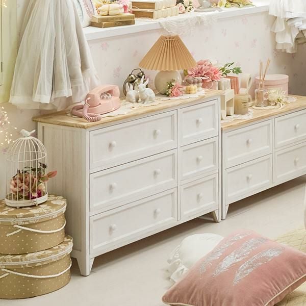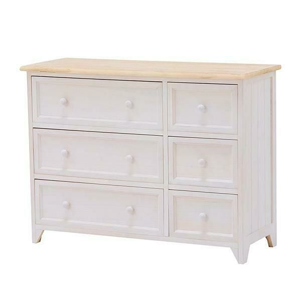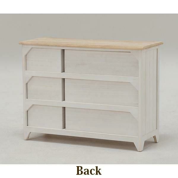 シャビーホワイトの本体にアンティーク調ナチュラルな天板が映える、シンプルなワイドチェスト。
