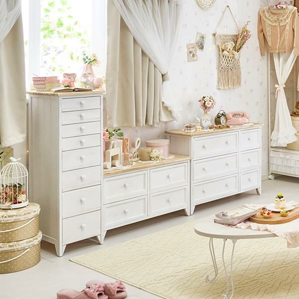 アンティークテイストの素材感や取っ手、サイドラインがかわいらしさを演出します。