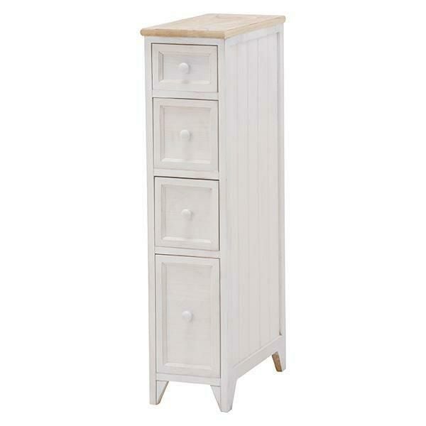 シャビーホワイトの本体にアンティーク調ナチュラルな天板が映える、省スペースで場所をとらないスリムなラック。