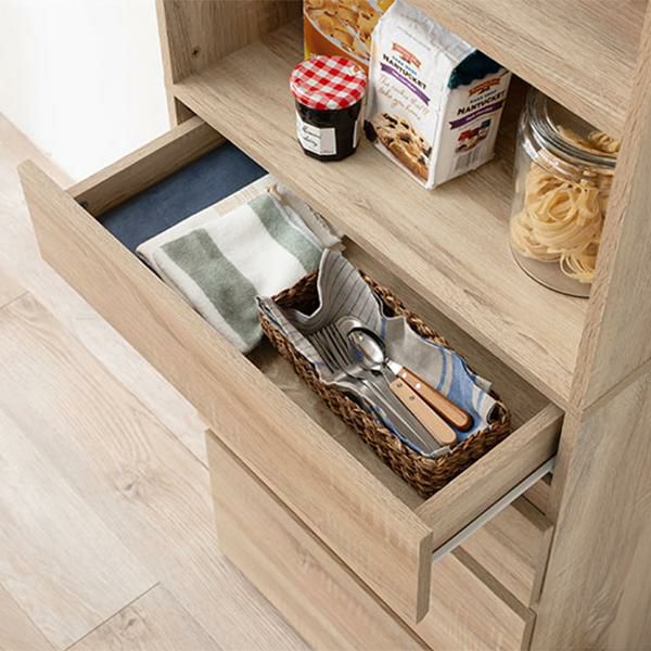 扉つき棚、オープン棚、引き出しを兼ね備えた収納力。