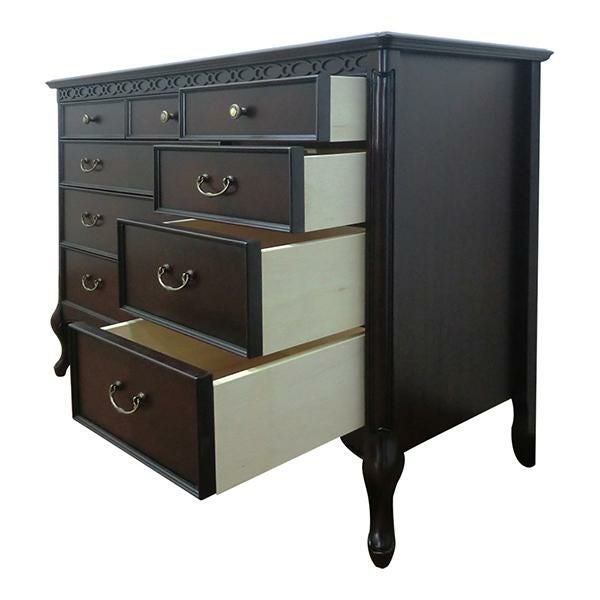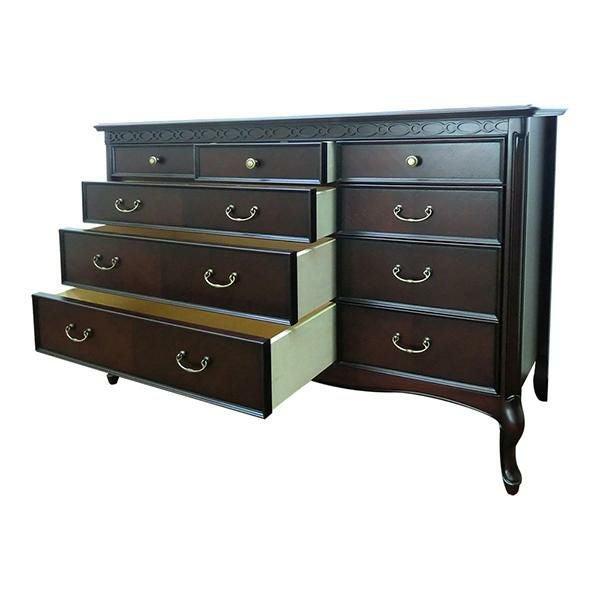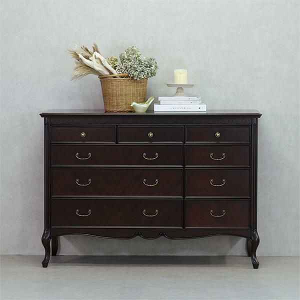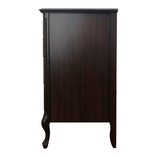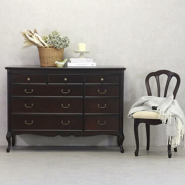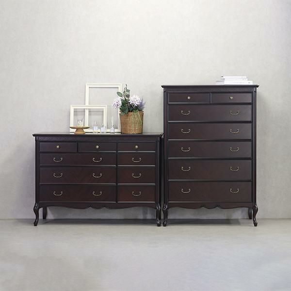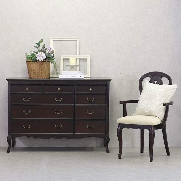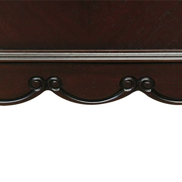 18世紀、ルイ15世時代のフランス宮廷から始まり、貴族の宮殿や上流階級のご婦人を中心に流行した、直線を排した軽快で華麗なフランス・サロン文化を彩る装飾様式だったロココ調家具のエッセンスを残したフレンチカントリースタイルを、よりカジュアルに実用的なアイテムでセレクトしたトータルコーディネートシリーズです。マホガニー材を贅沢に使い、表面は厳選された木目を使った化粧張りを施し、フレンチエレガンスの代名詞といえる「カブリオールレッグ」(猫脚)と、なめらかな女性的な美しいラインとマホガニー無垢材を削り出した彫刻が特徴です。