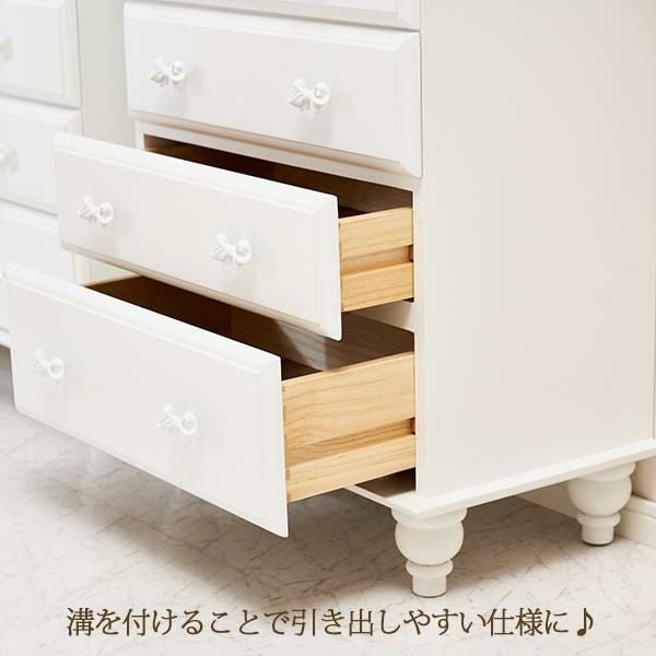 引き出しサイドには溝を付けて引き出しやすい仕様に。可愛いだけでなく使いやすさにもこだわりました。