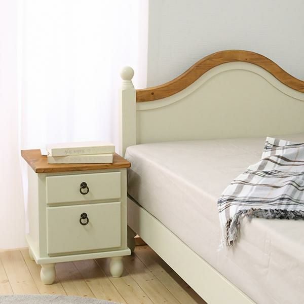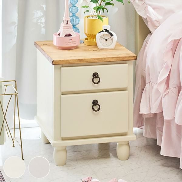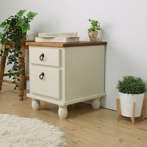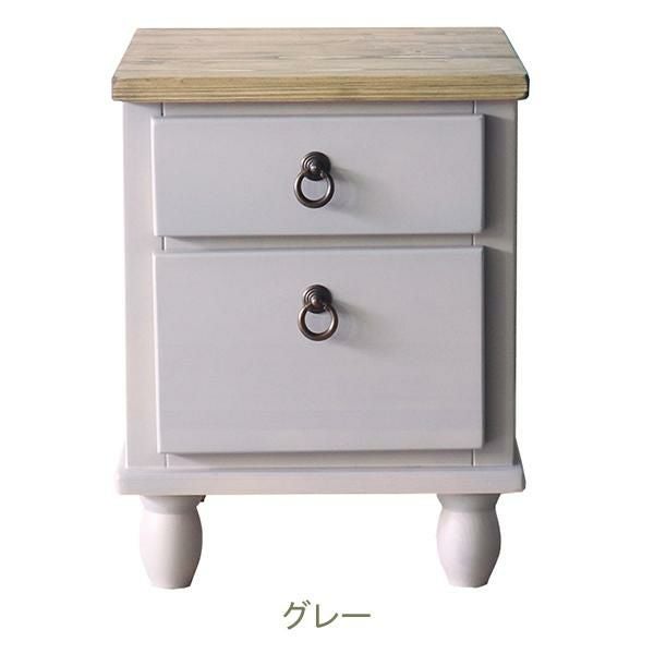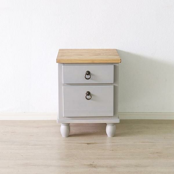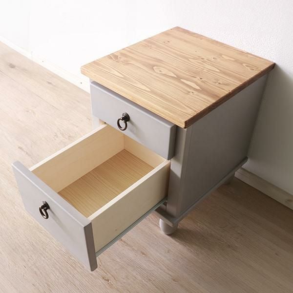 スクエアなフォルムとアンティーク調の取っ手などディテールが特徴的なナイトテーブル。