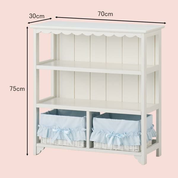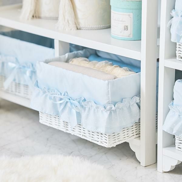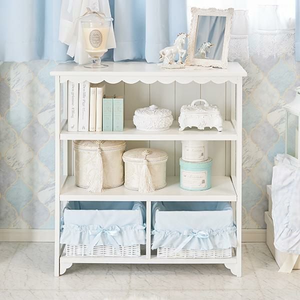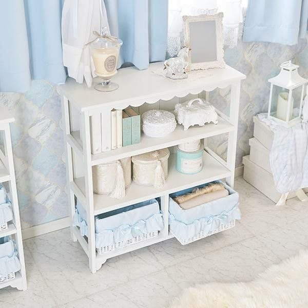 たっぷりフリルとリボンのバスケットにスカラップのデザインで、可愛いをたっぷり詰め込んだバスケットラック♪