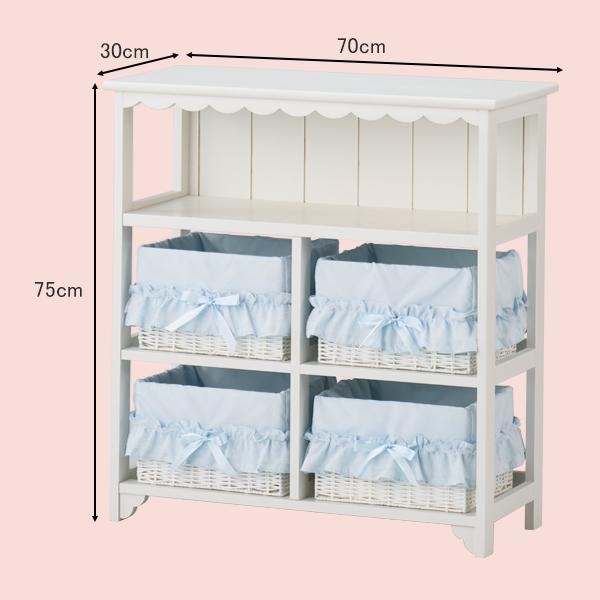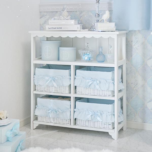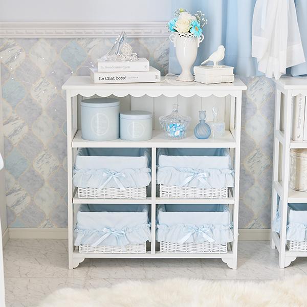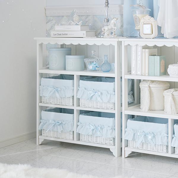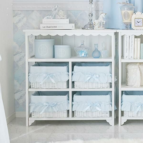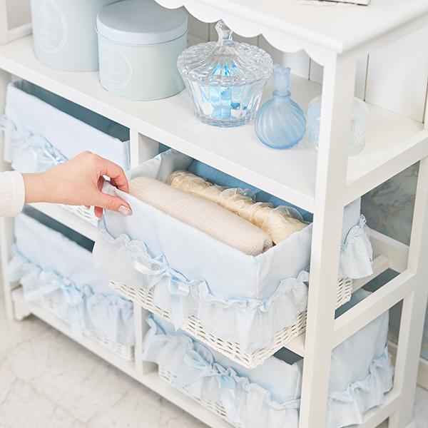 たっぷりフリルとリボンのバスケットにスカラップのデザインで可愛いをたっぷり詰め込んだバスケットラック♪